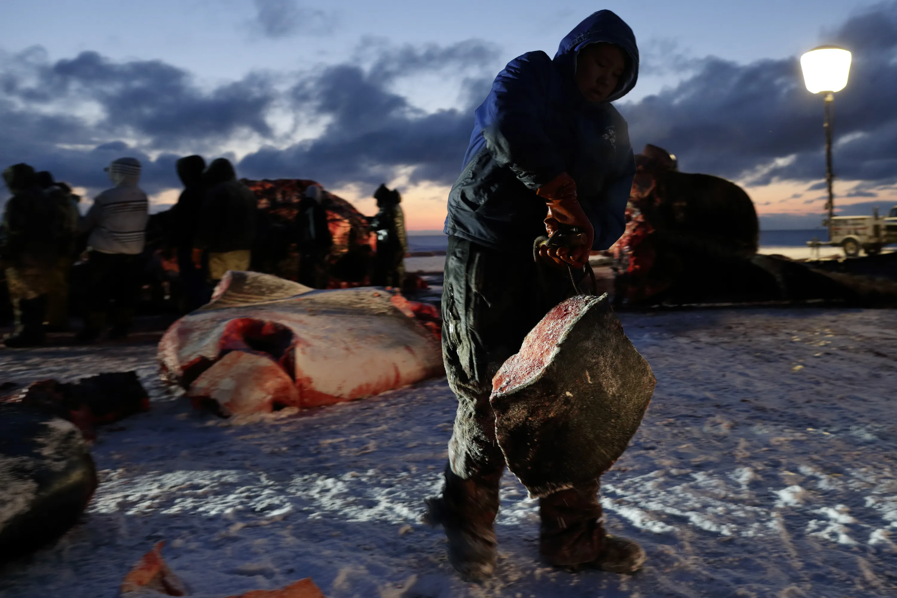 In this October 7, 2014, photo, a man hauls whale blubber as a bowhead whale is butchered near Barrow, Alaska. The whale skin and blubber, known as muktuk, is prized by the Inupiat, and often eaten frozen. (Photo by Gregory Bull/AP Photo)