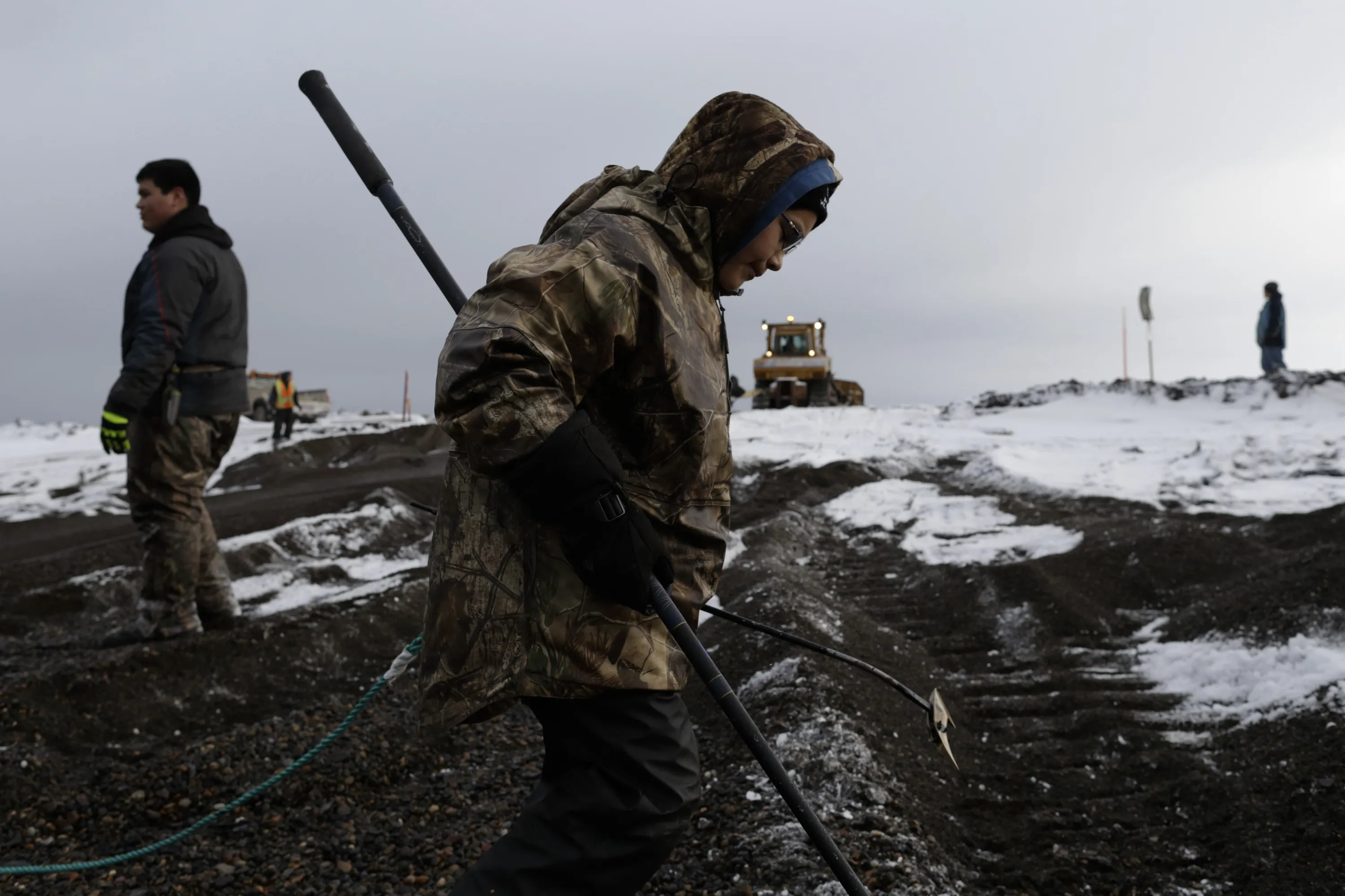 In this October 7, 2014, photo, Crawford Patkotak carries a harpoon attached to a buoy after his crew landed a bowhead whale, as the whale is hauled ashore in a field near Barrow, Alaska. Most members of a whaling family pitch in once a whale is caught. Often, three generations of a whaling family are at the task of butchering and dividing the whale. (Photo by Gregory Bull/AP Photo)