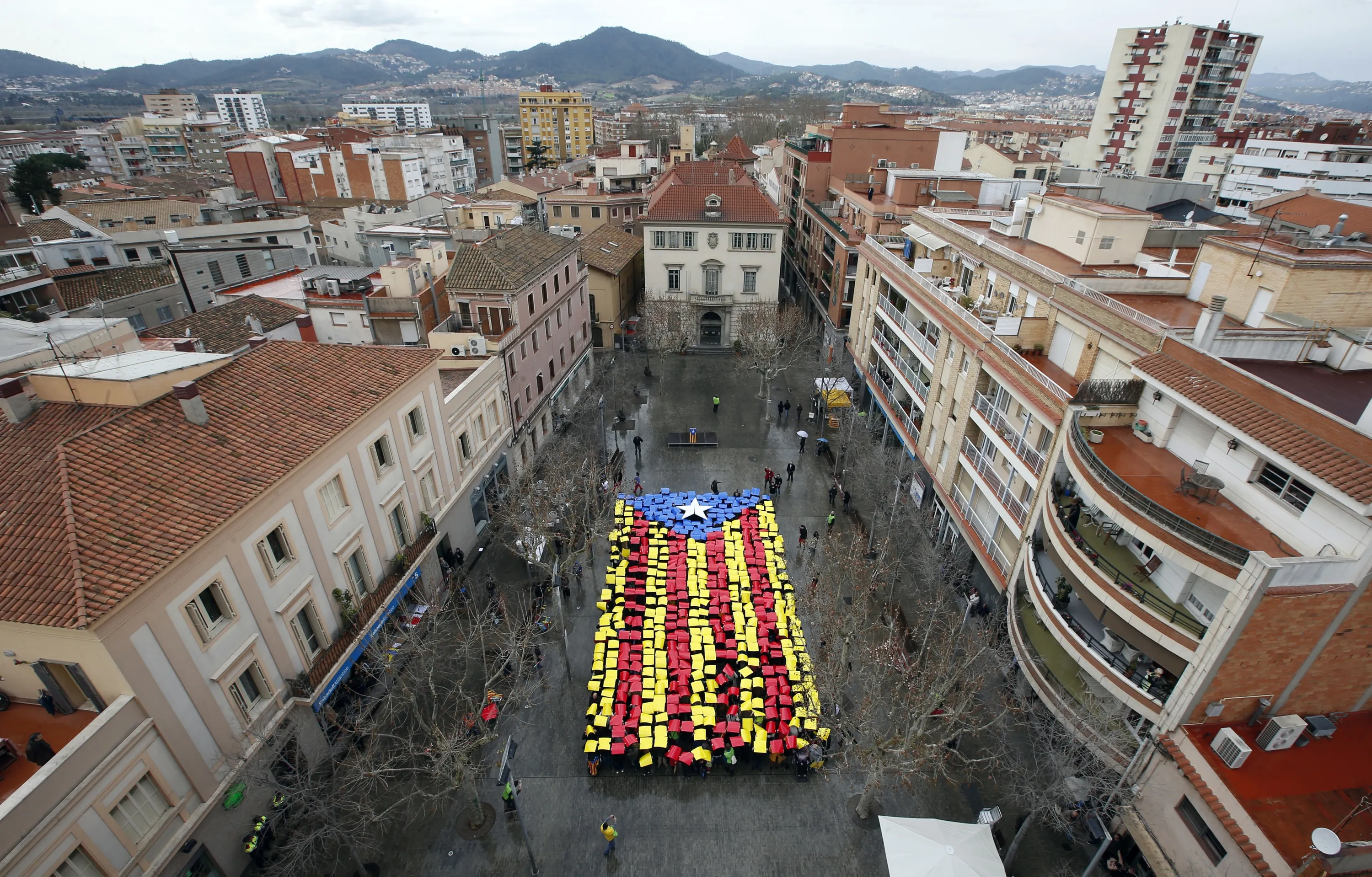 People hold placards to form a giant Estelada, the Catalan separatist flag, in front of the Sant Feliu del Llobregat townhall, near Barcelona February 16, 2014. (Photo by Albert Gea/Reuters)