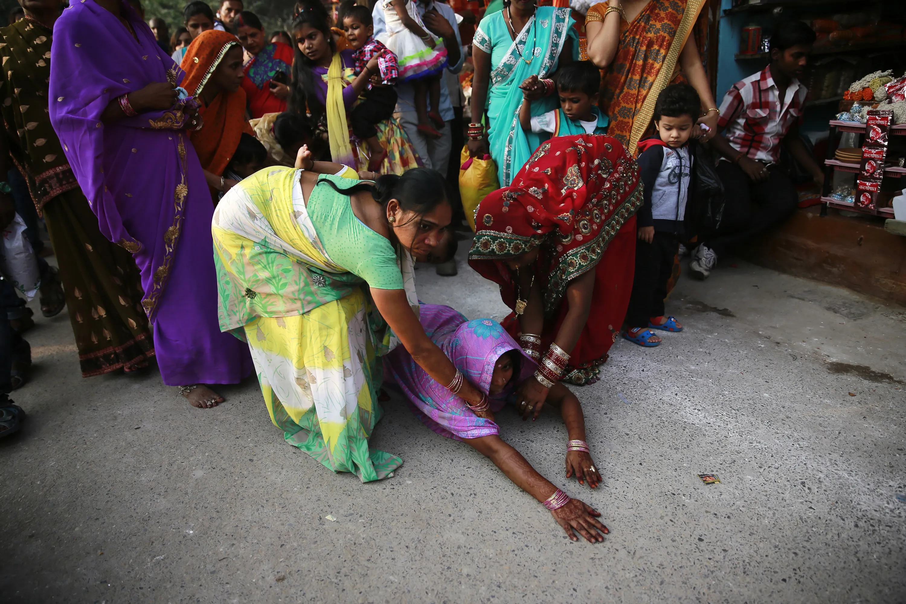 A woman prays for her child as she is comforted by relatives near the Ganges river in Varanasi, October 29, 2014. (Photo by Reuters/Stringer)
