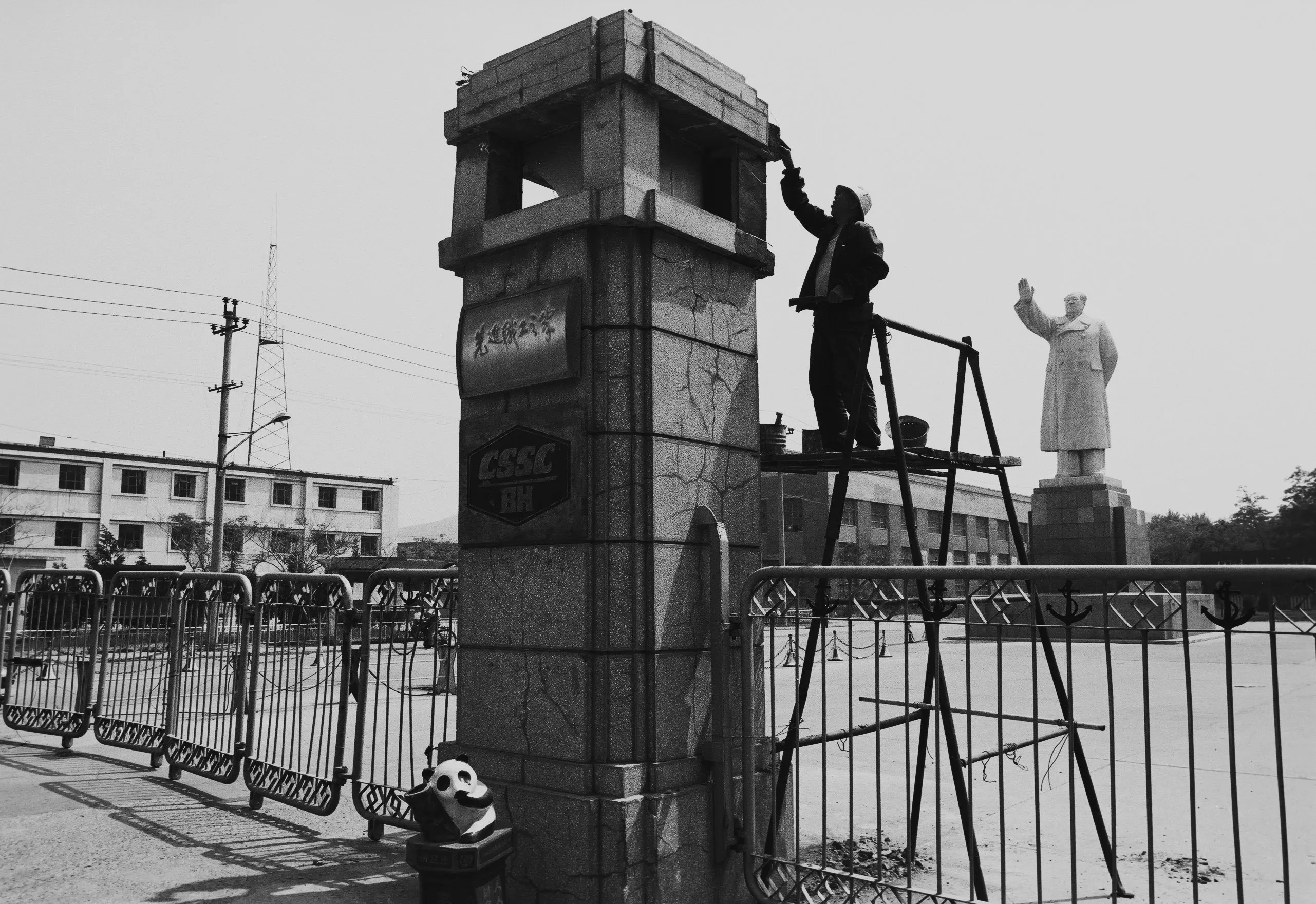 A worker repairs a pillar in front of a statue of the late Chinese leader Mao Zedong in Yingkou, Liaoning province in 1994. (Photo by Reuters/China Daily)