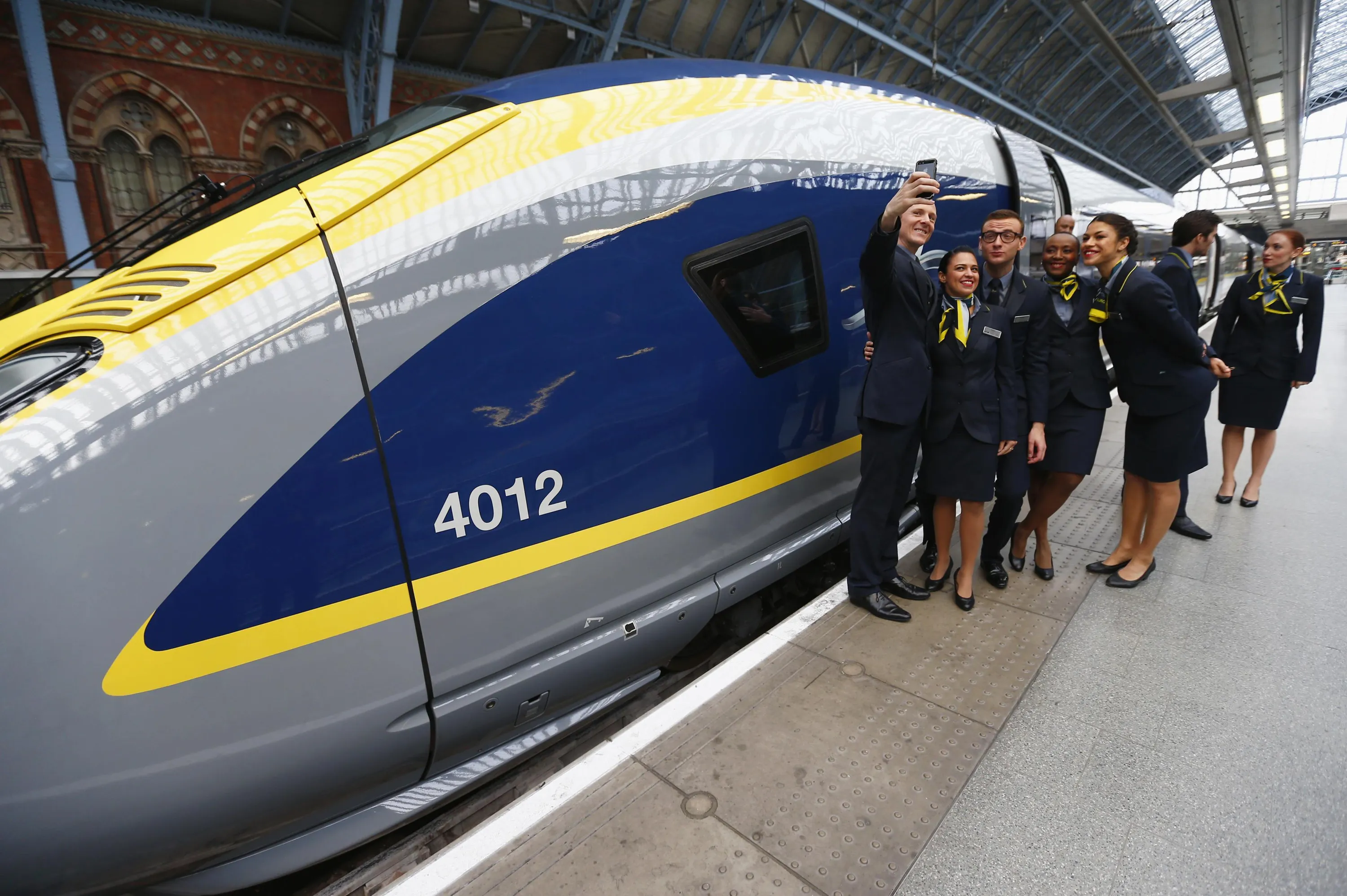 Eurostar employees pose for a selfie next to their new Siemens e320 train at St Pancras station in central London, November 13, 2014. Eurostar, the company that runs passenger trains through the Channel tunnel between London and Paris, said it would buy seven additional e320 trains from Siemens for about 300 million pounds ($473 million). The company placed an order for 10 new trains in 2010, the first of which is due to enter commercial service next year, enabling the company to add new routes. (Photo by Andrew Winning/Reuters)