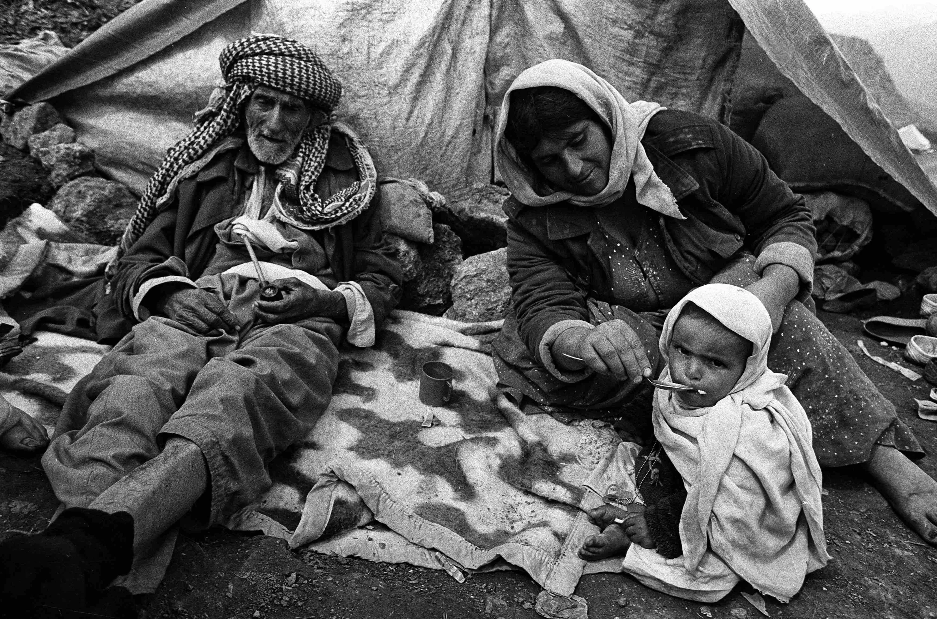 Iraqi Kurdish refugees sit in front of a tent in Cukurca refugee camp in Turkey April 8, 1991. (Photo by Srdjan Zivulovic/Reuters)