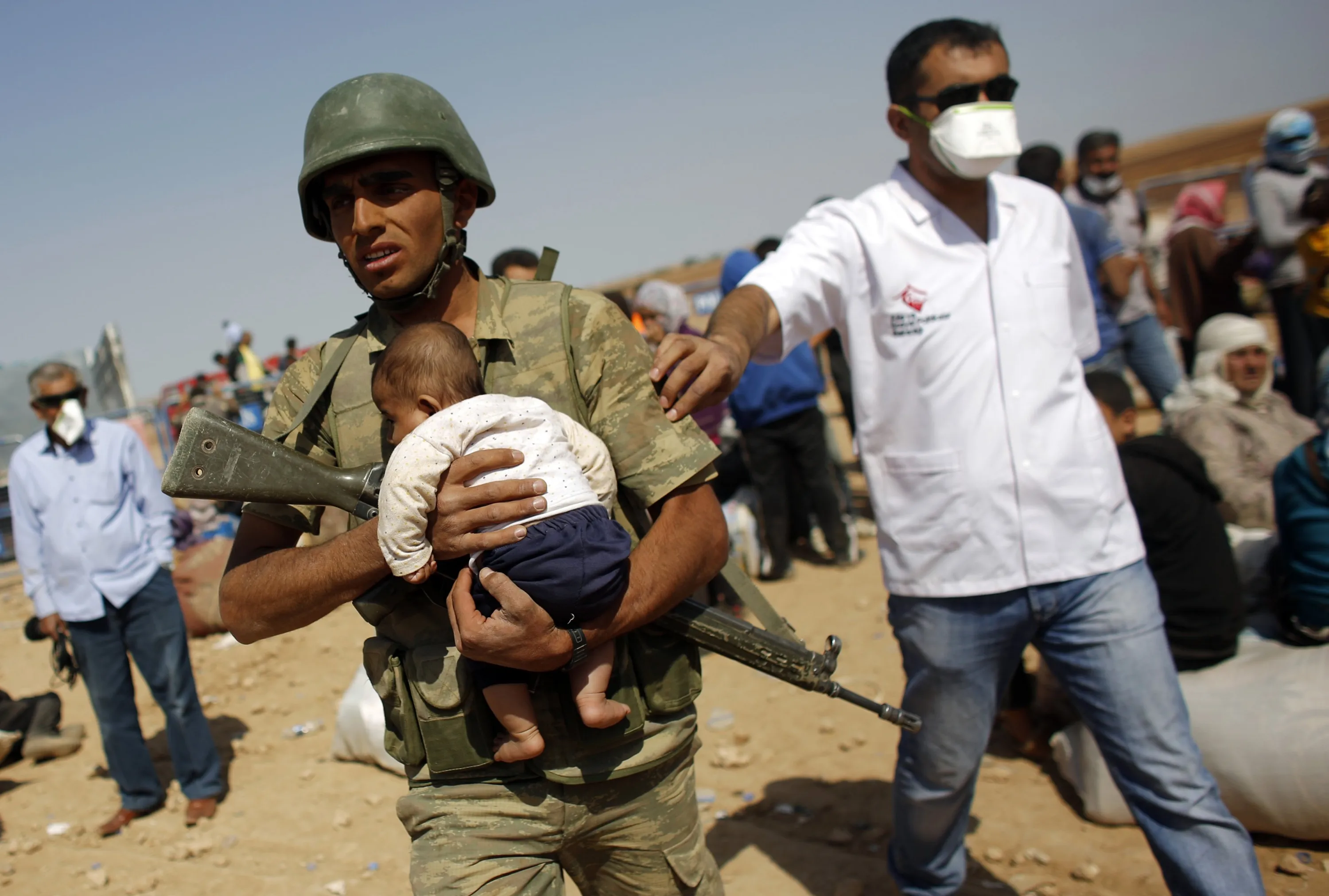 A Turkish soldier carries a Syrian Kurdish refugee baby from the Syrian border town Kobani, near the southeastern Turkish town of Suruc in Sanliurfa province in this October 2, 2014 file photo. (Photo by Murad Sezer/Reuters)
