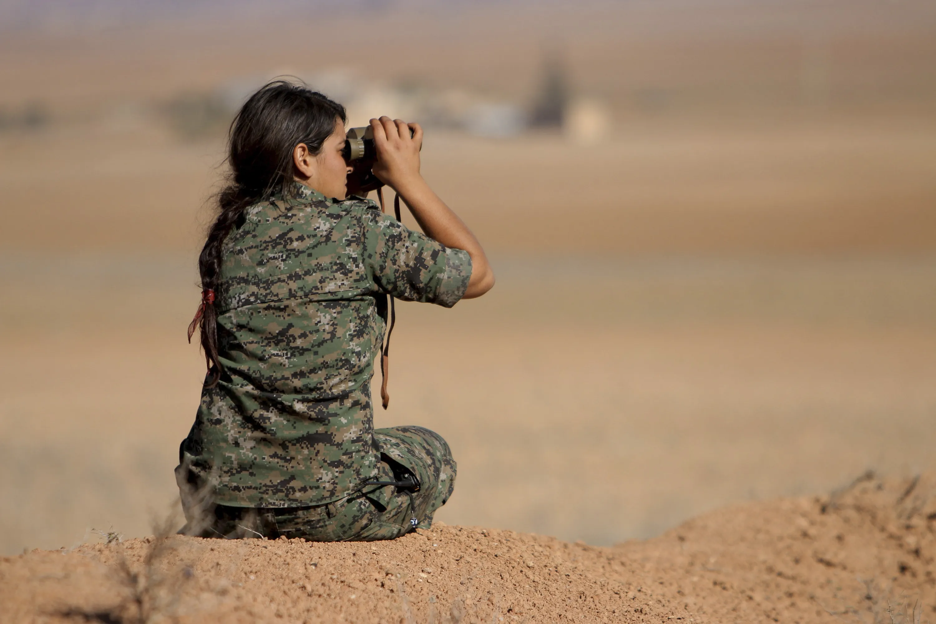 A female fighter of the Kurdish People's Protection Units (YPG) uses a pair of binoculars as she looks towards areas controlled by Islamic State fighters in the southern countryside of Ras al-Ain November 9, 2014. (Photo by Rodi Said/Reuters)