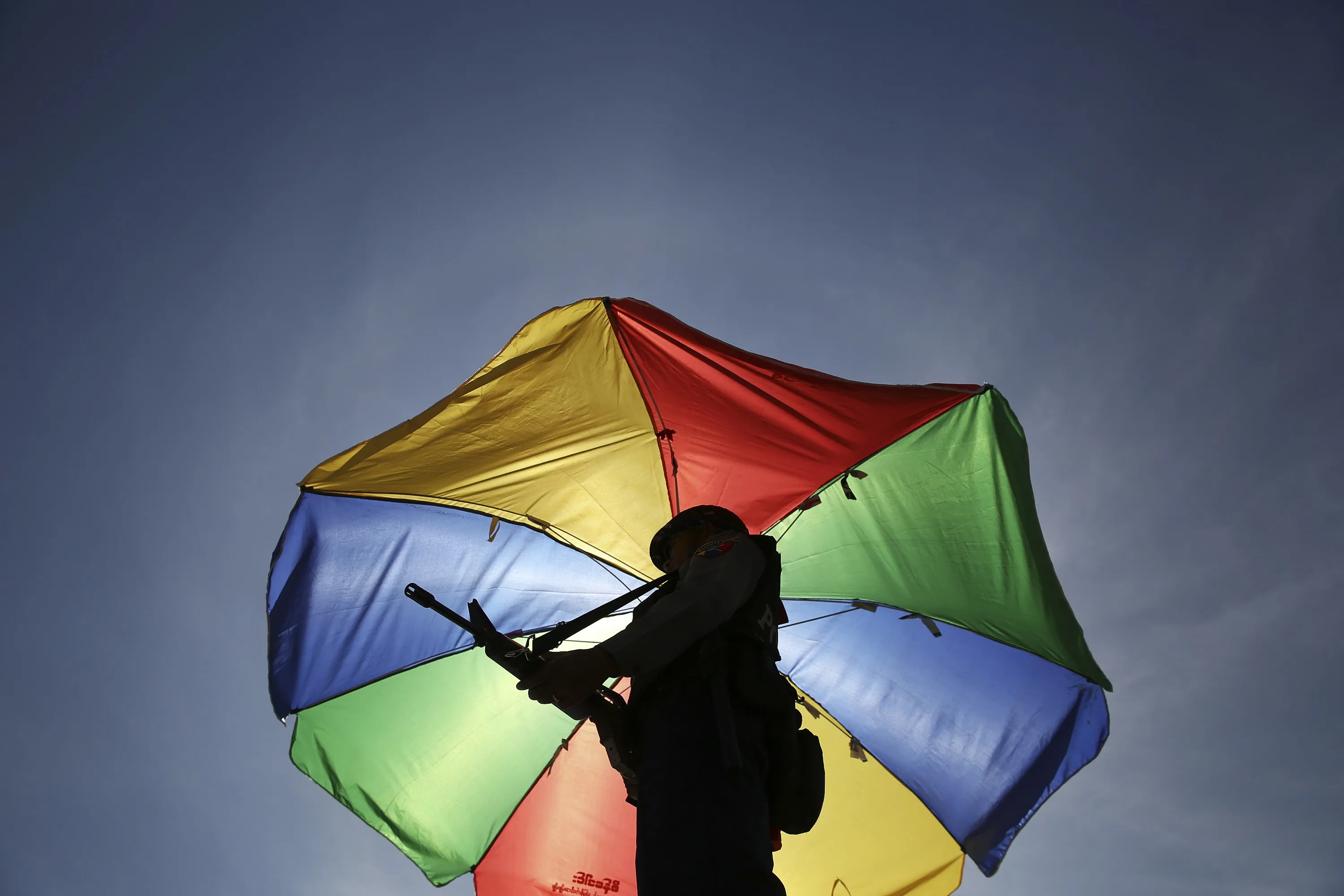 A policeman stands guard under a colourful umbrella along the road leading to the ASEAN summit venue as security in tightened in Naypyitaw November 10, 2014. Leaders from ASEAN, East Asian and other countries will gather for the ASEAN summit this week in Myanmar's capital, Naypyitaw. United States President Barak Obama is scheduled to attend. (Photo by Damir Sagolj/Reuters)