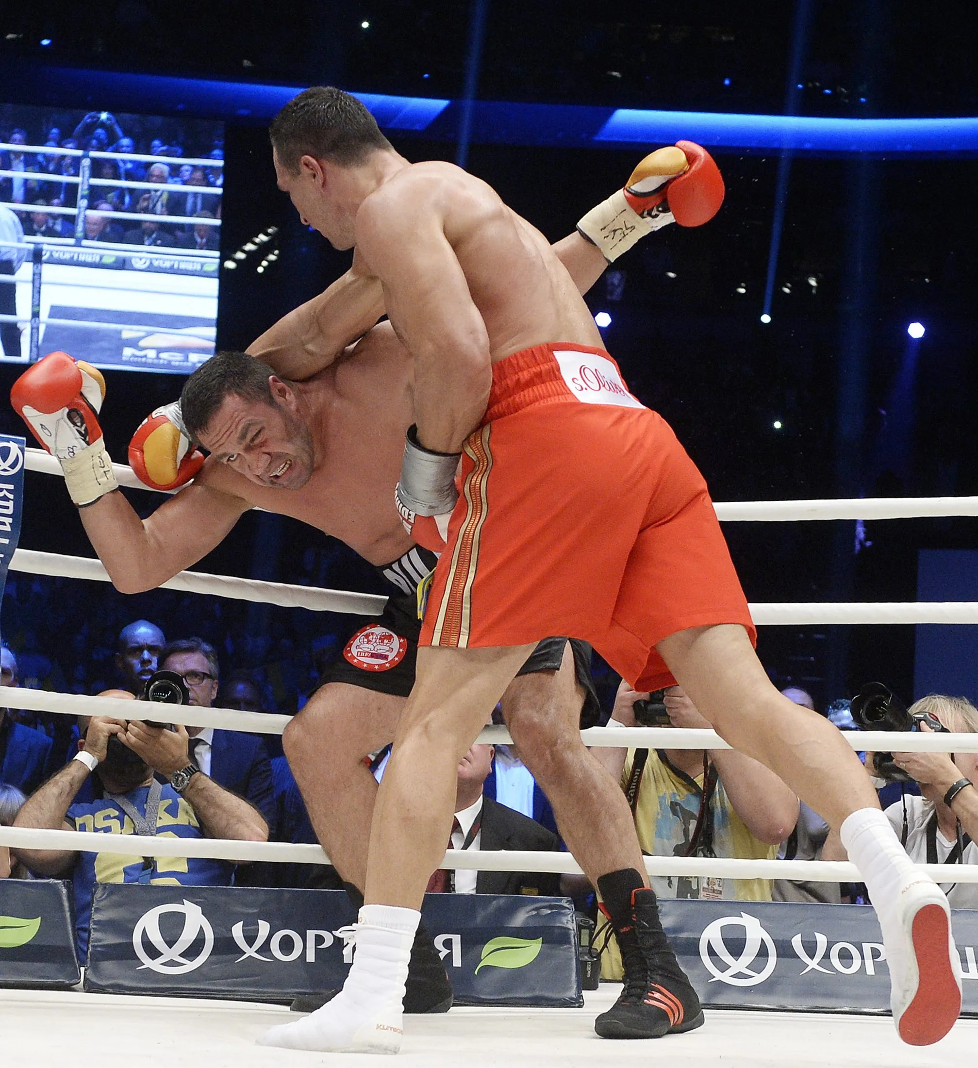 Ukrainian WBA, WBO, IBO and IBF heavyweight boxing world champion Vladimir Klitschko (R) lands a punch during his title fight against challenger Bulgarian heavyweight boxer Kubrat Pulev in Hamburg, November 15, 2014. (Photo by Fabian Bimmer/Reuters)