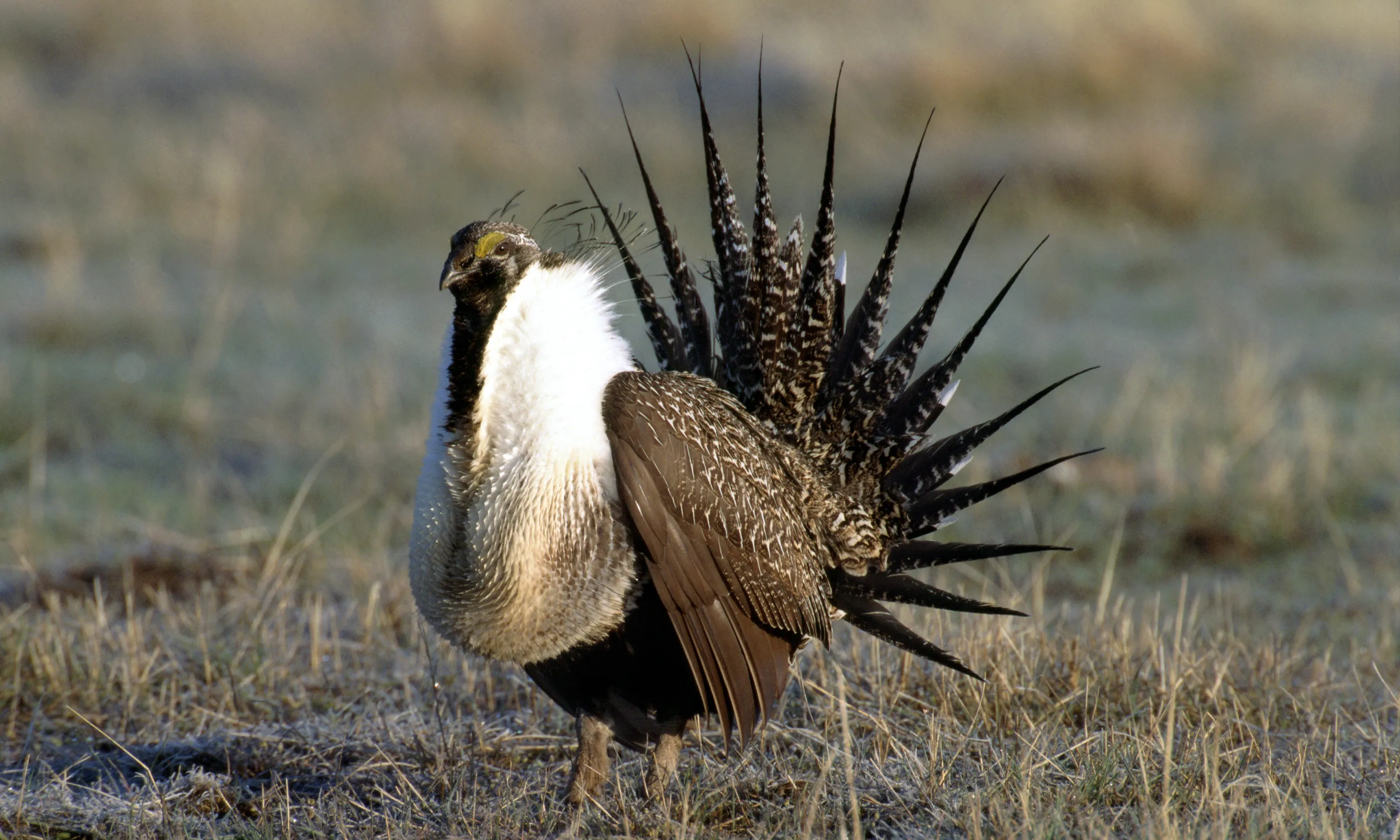 The Greater Sage-Grouse is certainly a formidable-looking bird. Being the largest grouse in North America and having tail feathers, which look like giant spikes, make for a ferocious sight. These birds are well known for their complicated courtship rituals, in which the males perform a special “strutting display” to attract the females. Another distinct feature of the Greater Sage-Grouse is two large yellow throat sacs (gular sacs), which are inflated by the males during the courtship display. Unlike pelicans, whose gular sacs are used to store fish while hunting, the throat sacks of the Greater Sage-Grouse are merely for display.