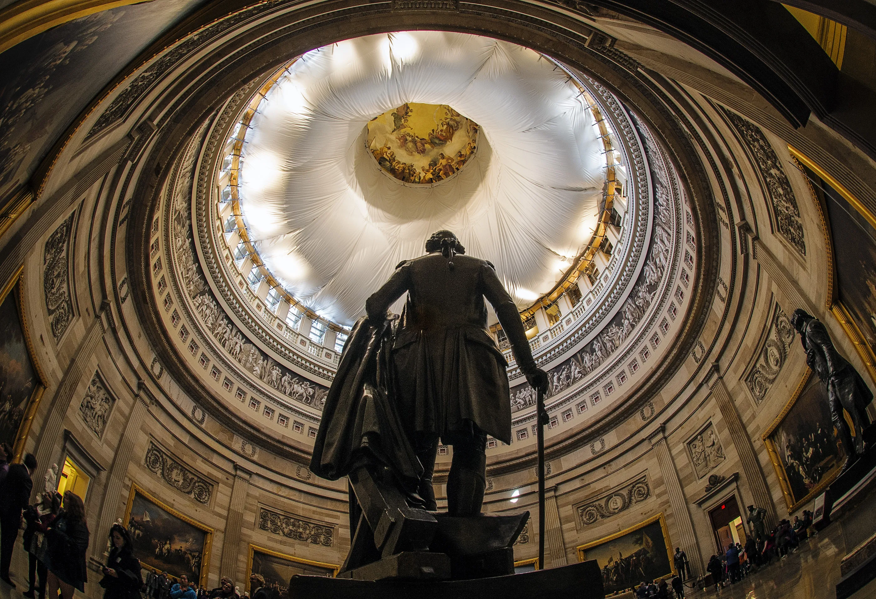 The Architect of the Capitol briefs assembled press on the progress of the U.S. Capitol Dome Restoration Project on November, 18, 2014 in Washington, DC. Pictured, a view of the interior of the Rotunda, showing the protection beneath the dome during construction.