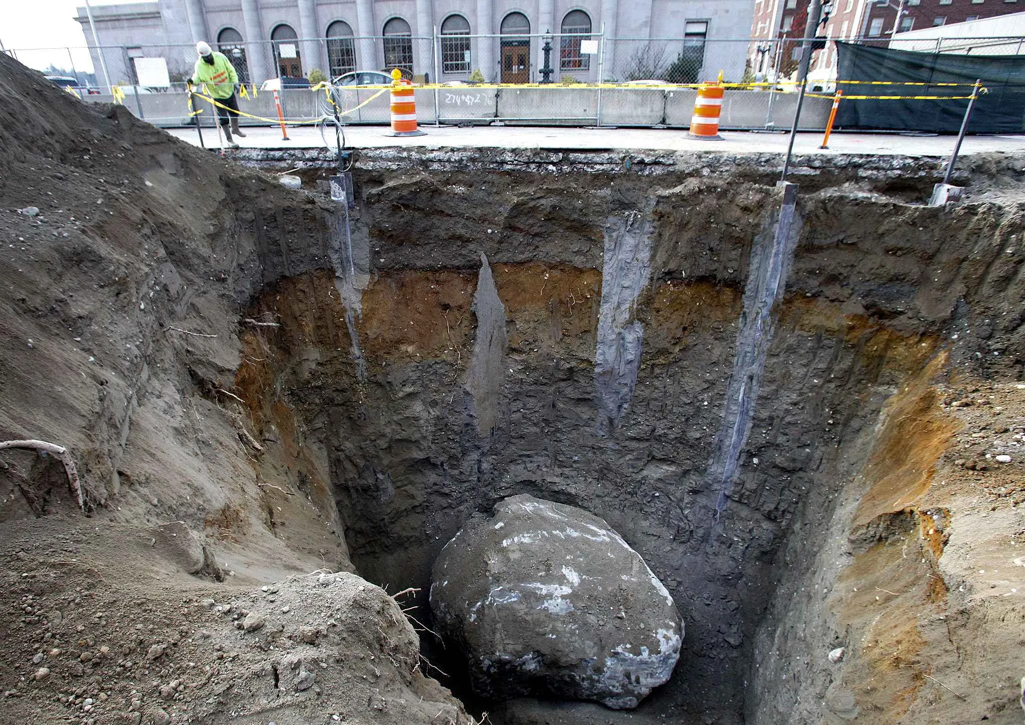 A glacial erratic rock estimated to be 300,000 pounds and two million years old lies 30 feet below ground after being fully unearthed on Wednesday, November 19, 2014, at the Courtyard by Marriott construction site in Everett, Wash. A geotechnical engineer who was called out to examine it, Kurt Merriman, told The Daily Herald it's a glacial erratic, a giant rock left behind by a glacier maybe 18,000 years ago. The boulder is bigger than an SUV, weighing an estimated 150 tons. (Photo by Ian Terry/AP Photo/The Herald)