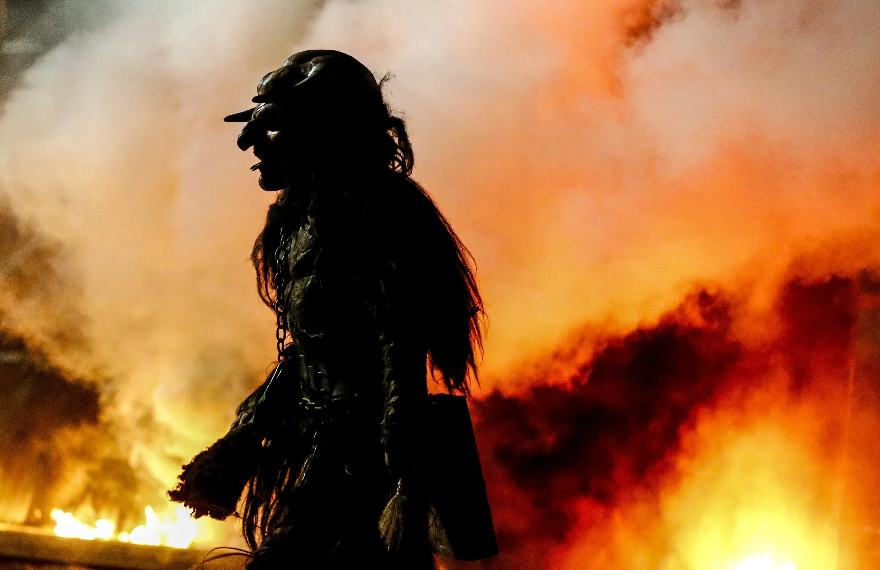 A man dressed in a traditional Perchten costume and mask performs during a Perchten festival in the western Austrian village of Huben November 22, 2014. (Photo by Dominic Ebenbichler/Reuters)