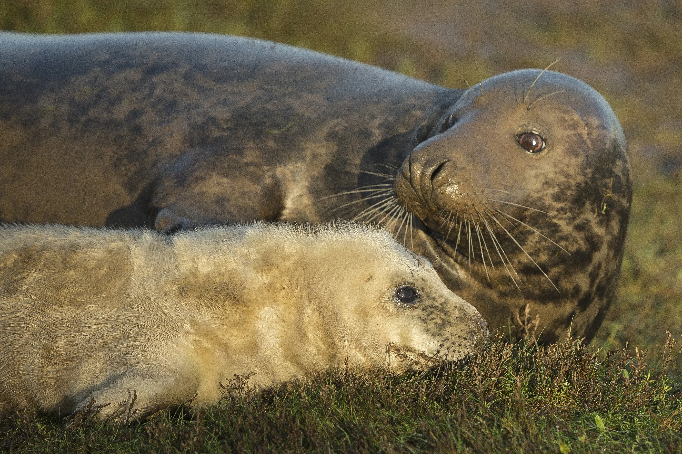 A Grey Seal pup and it's mother lay in the grass at the Lincolnshire Wildlife Trust's Donna Nook nature reserve on November 24, 2014 in Grimsby, England. (Photo by Dan Kitwood/Getty Images)