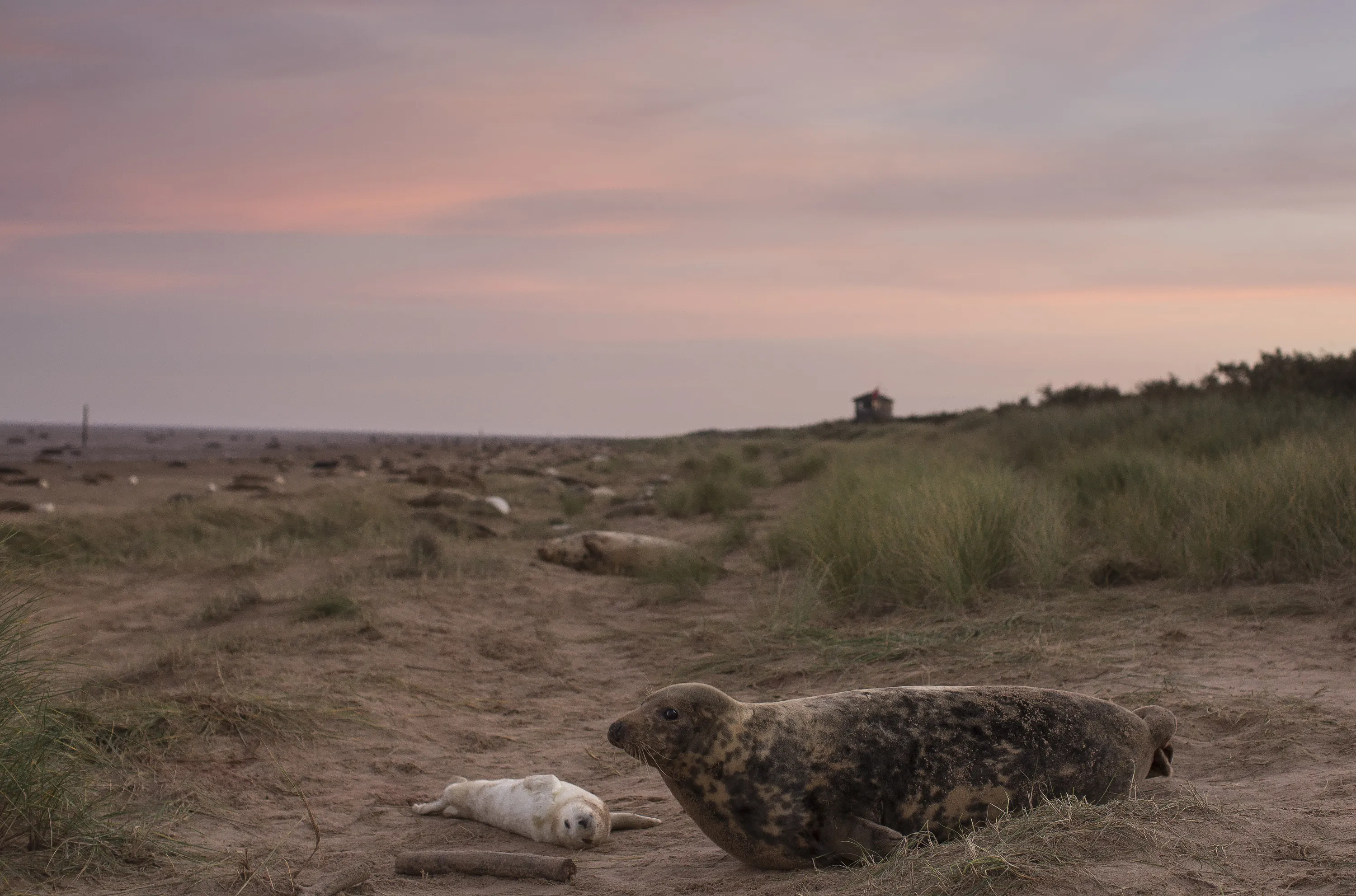 A Grey Seal pup lies with it's mother in the dunes at sunset near the Lincolnshire Wildlife Trust's Donna Nook nature reserve on November 24, 2014 in Grimsby, England. (Photo by Dan Kitwood/Getty Images)