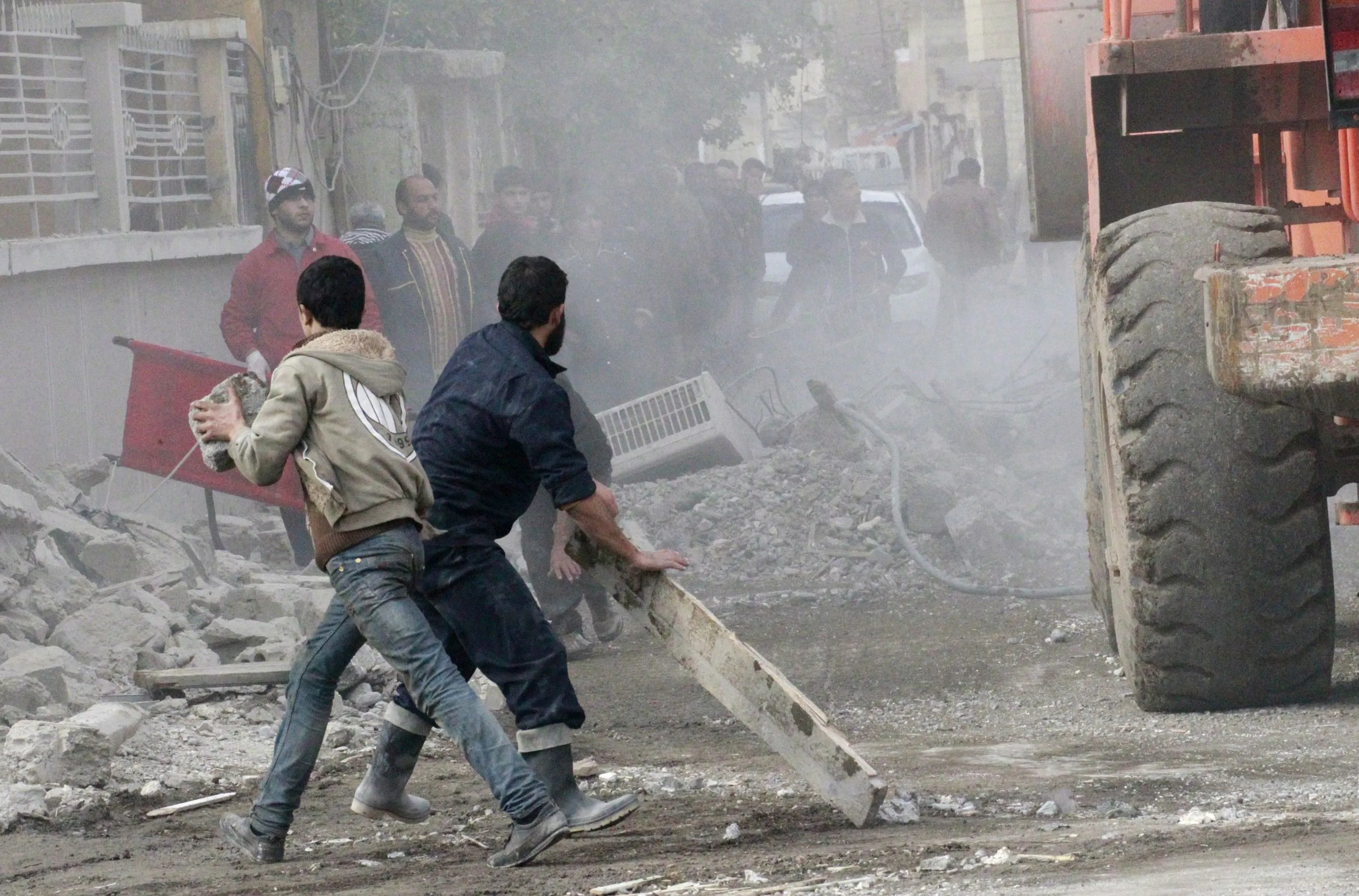 Men clear a damaged site hit by what activists said were airstrikes by forces loyal to Syria's President Bashar al-Assad in Raqqa, eastern Syria, which is controlled by the Islamic State November 27, 2014. (Photo by Nour Fourat/Reuters)