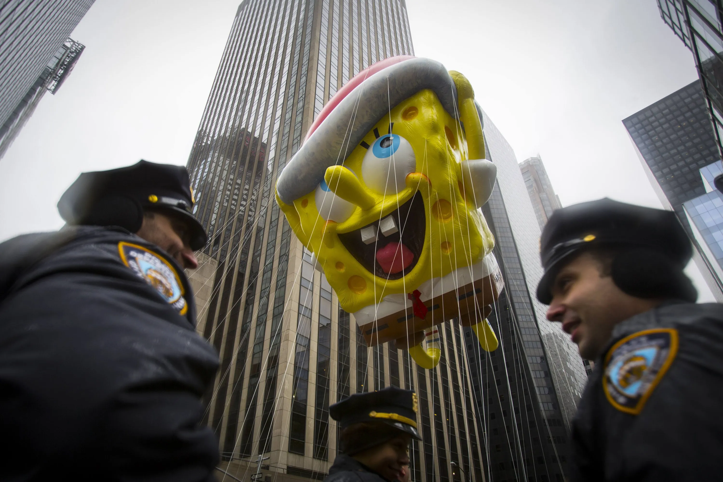 The Spongebob Squarepants balloon floats by New York Police Officers during the 88th Annual Macy's Thanksgiving Day Parade in New York November 27, 2014. (Photo by Andrew Kelly/Reuters)
