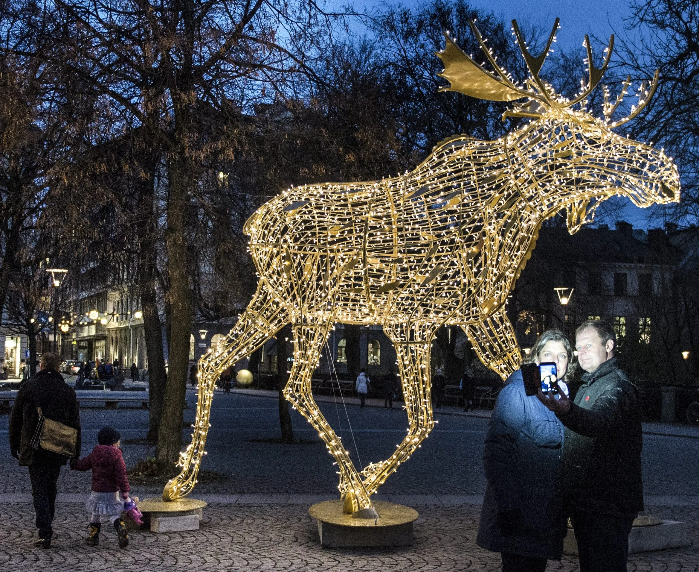 A couple takes a selfie in front of an illuminated Christmas moose decoration at Nybroplan in central Stockholm, Sweden, Saturday November 22, 2014, when some 710,708 different LED lights for the season, arranged by the city council, were switched on. (Photo by Jessica Gow/AP photo/TT News Agency)