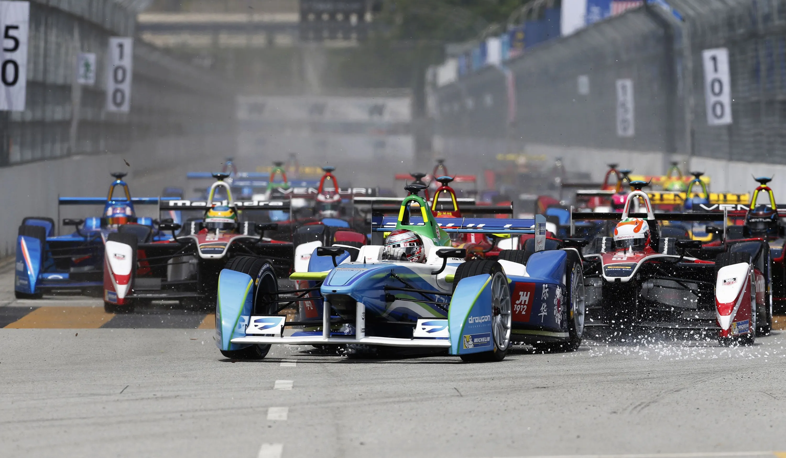 Drivers leave the starting grid during the Formula E Championship race in Putrajaya November 22, 2014. The FIA Formula E Championship is the world's first fully electric racing series. (Photo by Olivia Harris/Reuters)