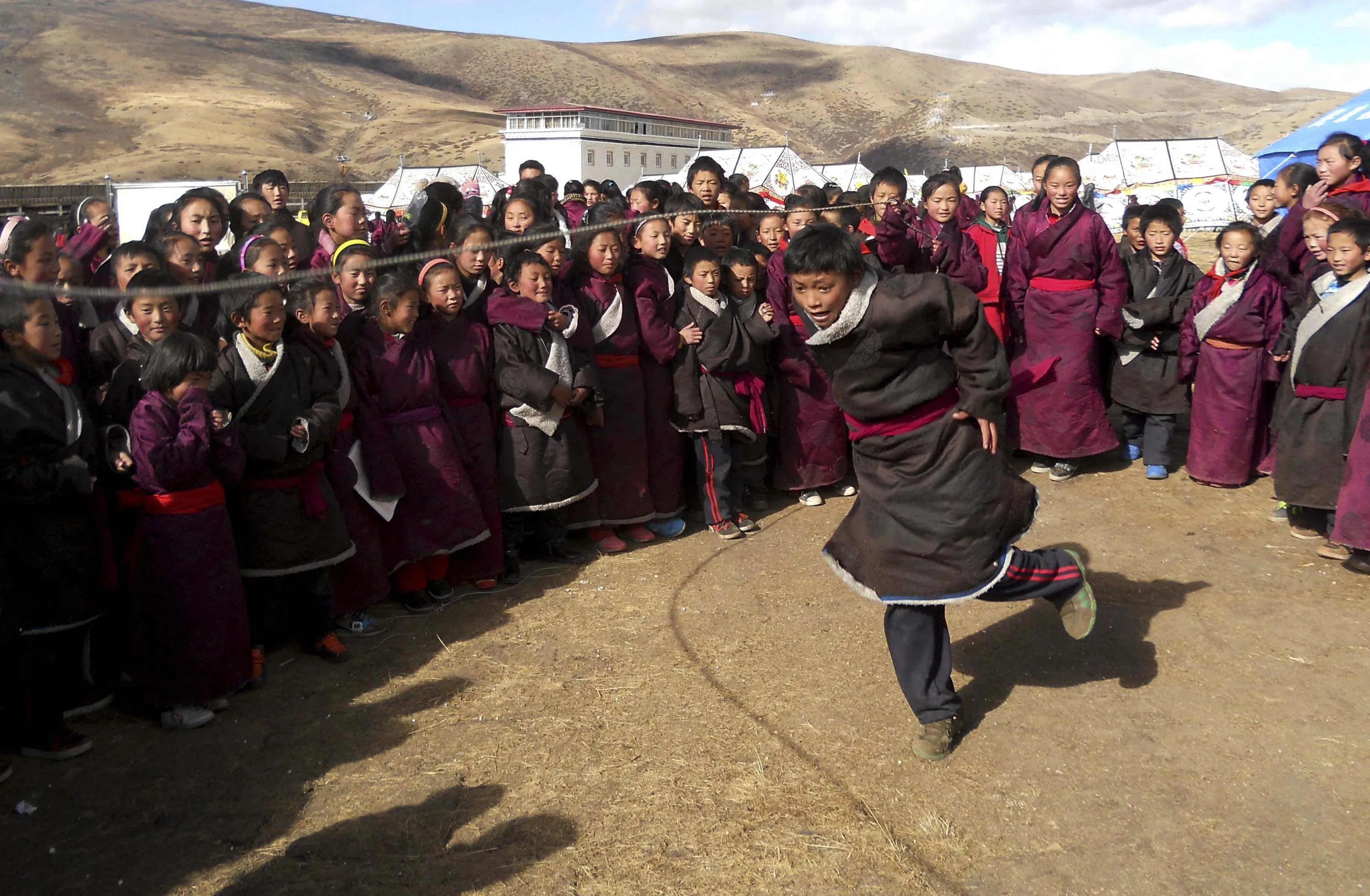 Tibetan students from a local primary school skip rope as they exercise near their temporary tents after an earthquake hit Kangding county, Sichuan province November 23, 2014. At least four people were killed and 54 others injured on Saturday after a 6.3 magnitude quake hit Kangding County in southwest China's Sichuan Province, Xinhua News Agency reported. (Photo by Reuters/China Daily)