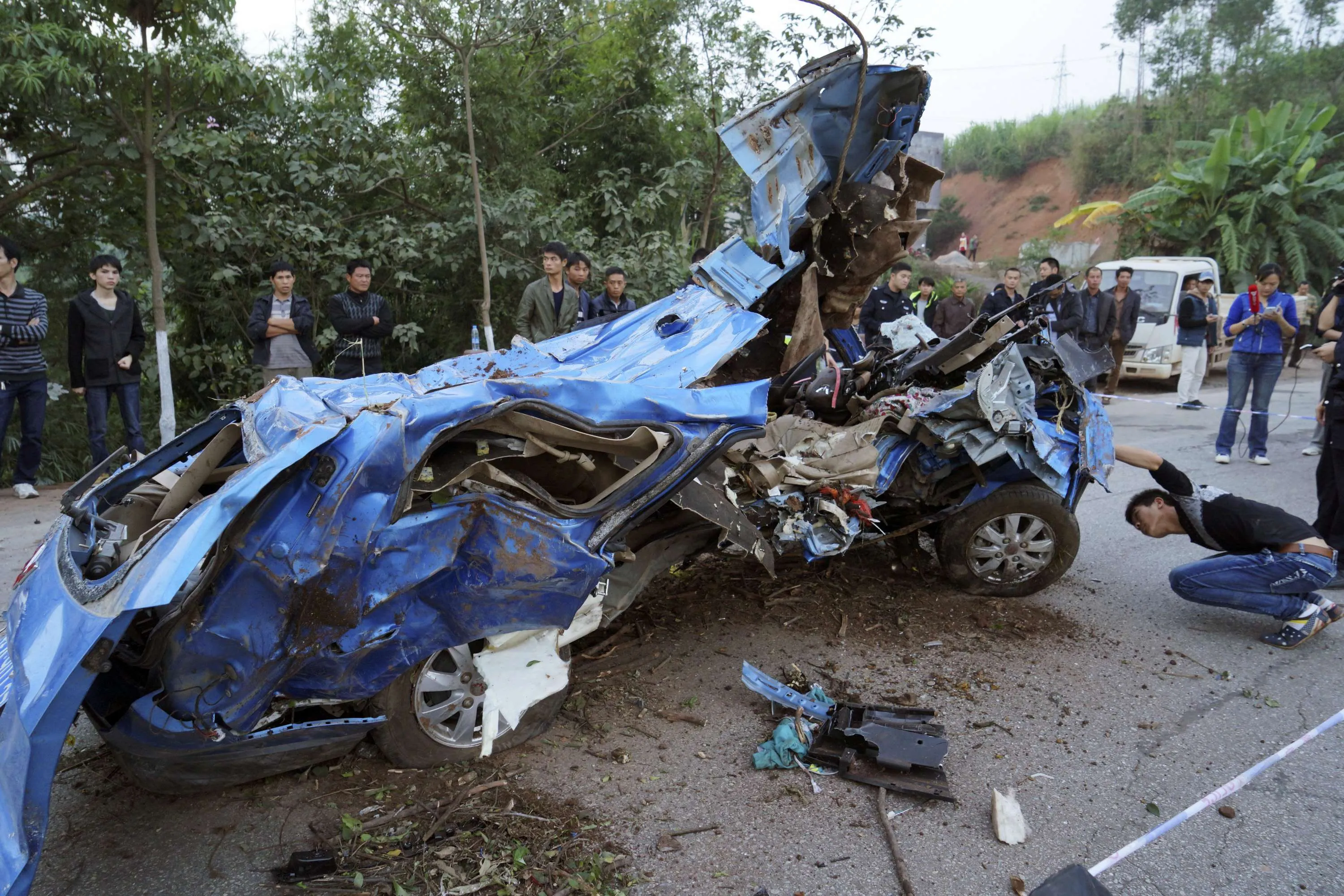 A man looks at the bottom of a destroyed minivan after it collided with a truck and fell off a ramp on the side of a street, in Nanning, Guangxi Zhuang Autonomous Region November 22, 2014. Eight people in the minivan, including a two-month-old baby and three young children, were killed in the accident on Saturday and a 14-year-old girl was injured and hospitalized, local media reported. (Photo by Reuters/Stringer)