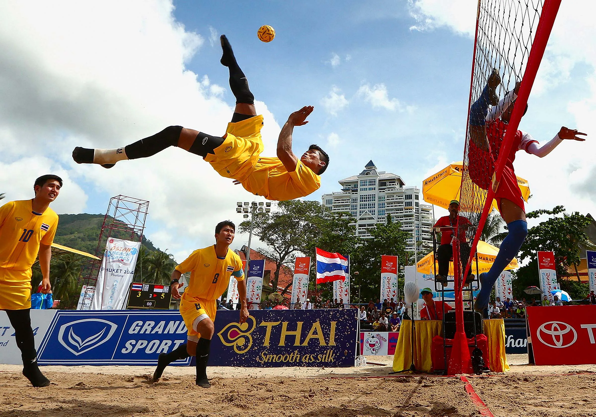 Phakpong Dejaroen of Thailand plays a shot during the Men's Beach Sepaktakraw Regu final between indonesia and Thailand during the 2014 Asian Beach Games at Patong Beach on November 23, 2014 in Phuket, Thailand. (Photo by Cameron Spencer/Getty Images)