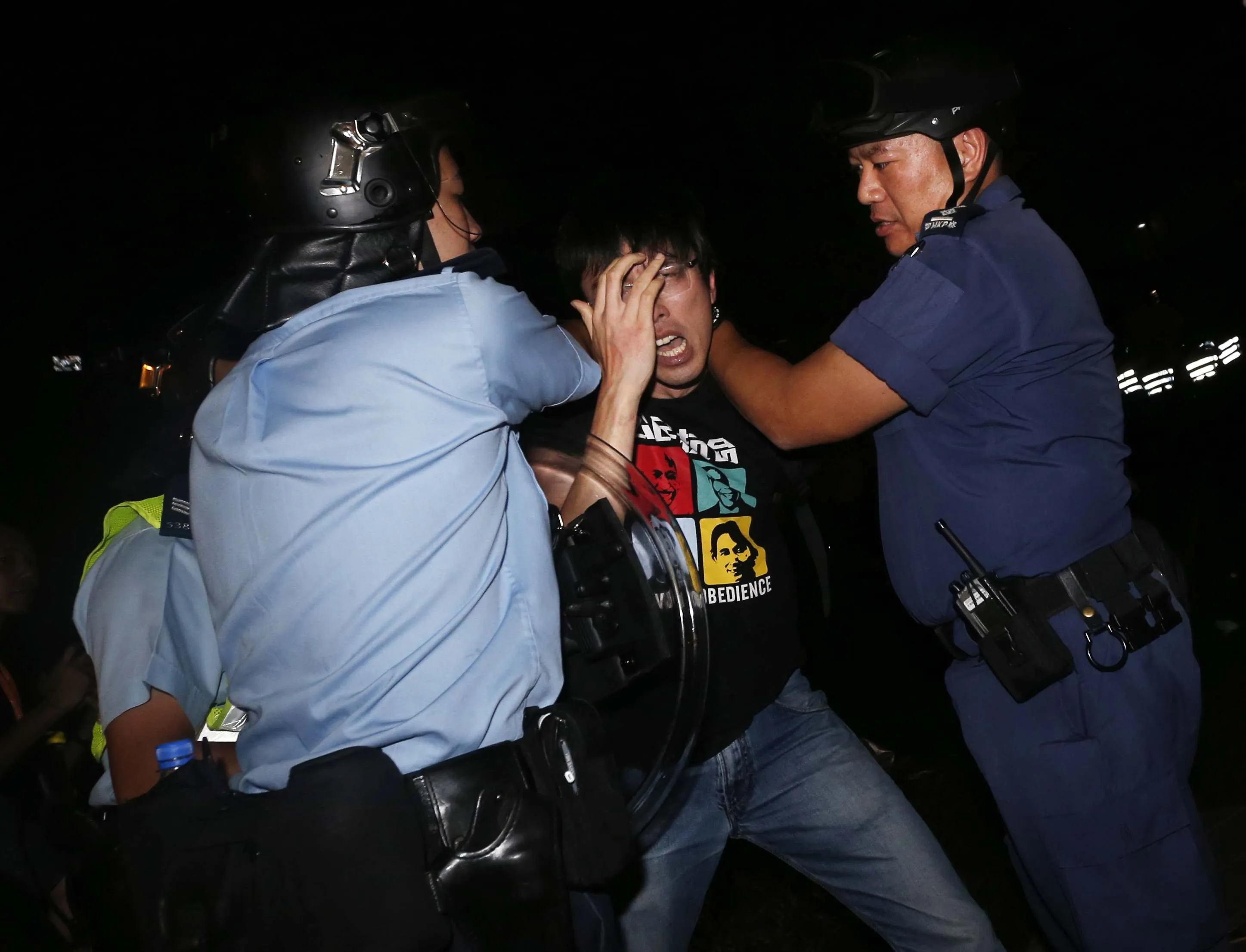 A pro-democracy protester is detained by riot police during a confrontation outside government headquarters in Hong Kong early December 1, 2014. (Photo by Bobby Yip/Reuters)