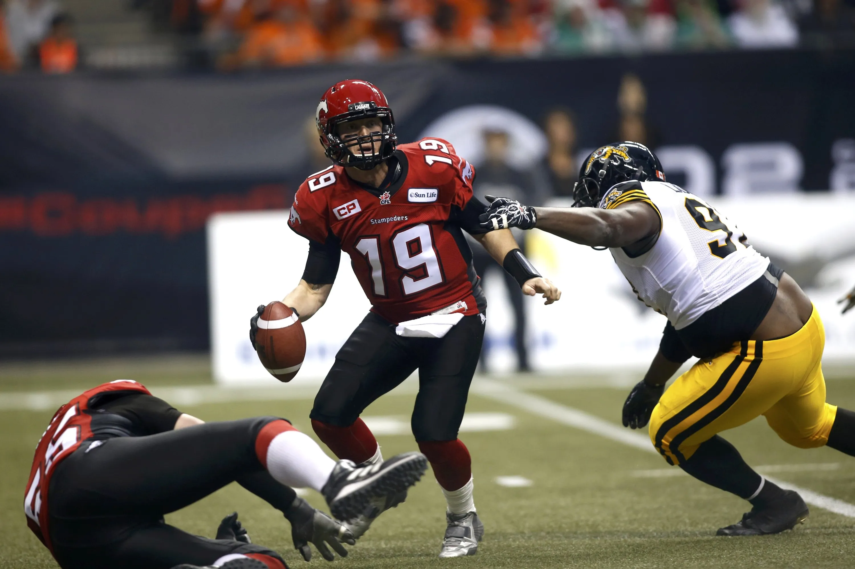 Calgary Stampeders' quarterback Bo Levi Mitchell scrambles while under pressure by Hamilton Tiger Cats' Ted Laurent in the first half during the CFL's 102nd Grey Cup football championship in Vancouver, British Columbia, November 30, 2014. (Photo by Ben Nelms/Reuters)