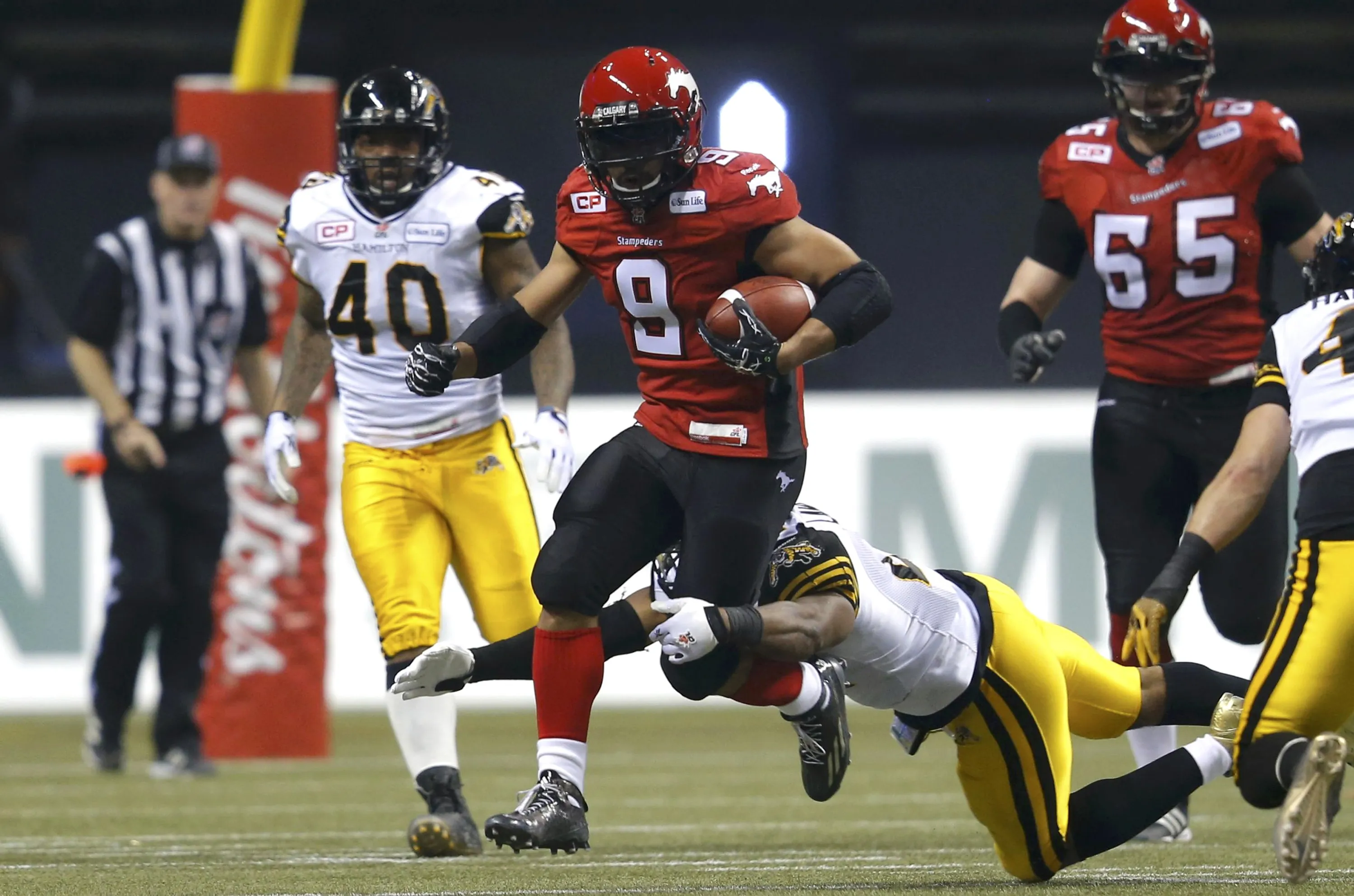 Calgary Stampeders' Jon Cornish tries to break away from Hamilton Tiger Cats' Simoni Lawrence during the first half of the CFL's 102nd Grey Cup football championship in Vancouver, British Columbia, November 30, 2014. (Photo by Todd Korol/Reuters)