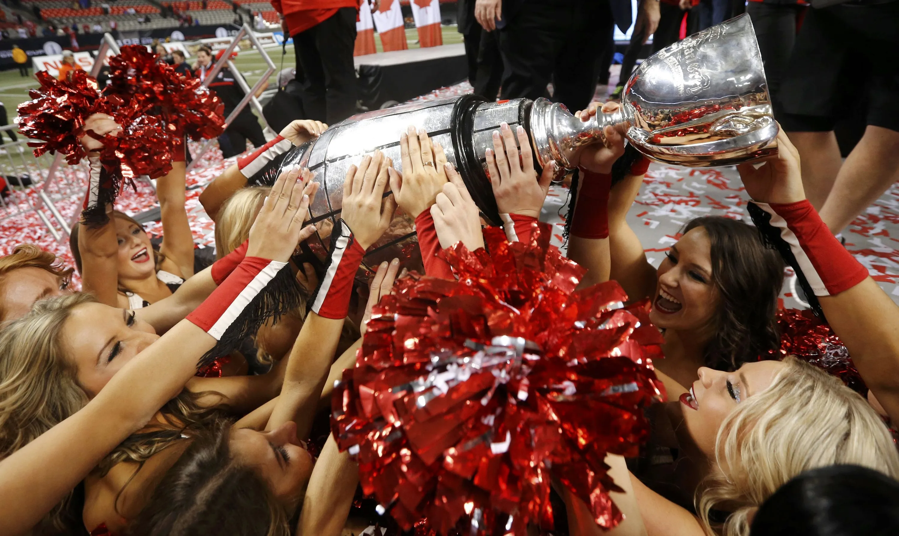 Calgary Stampeders cheerleaders celebrate with the Grey Cup after Calgary defeated the Hamilton Tiger Cats in the CFL's 102nd Grey Cup football championship in Vancouver, British Columbia, November 30, 2014. (Photo by Mark Blinch/Reuters)