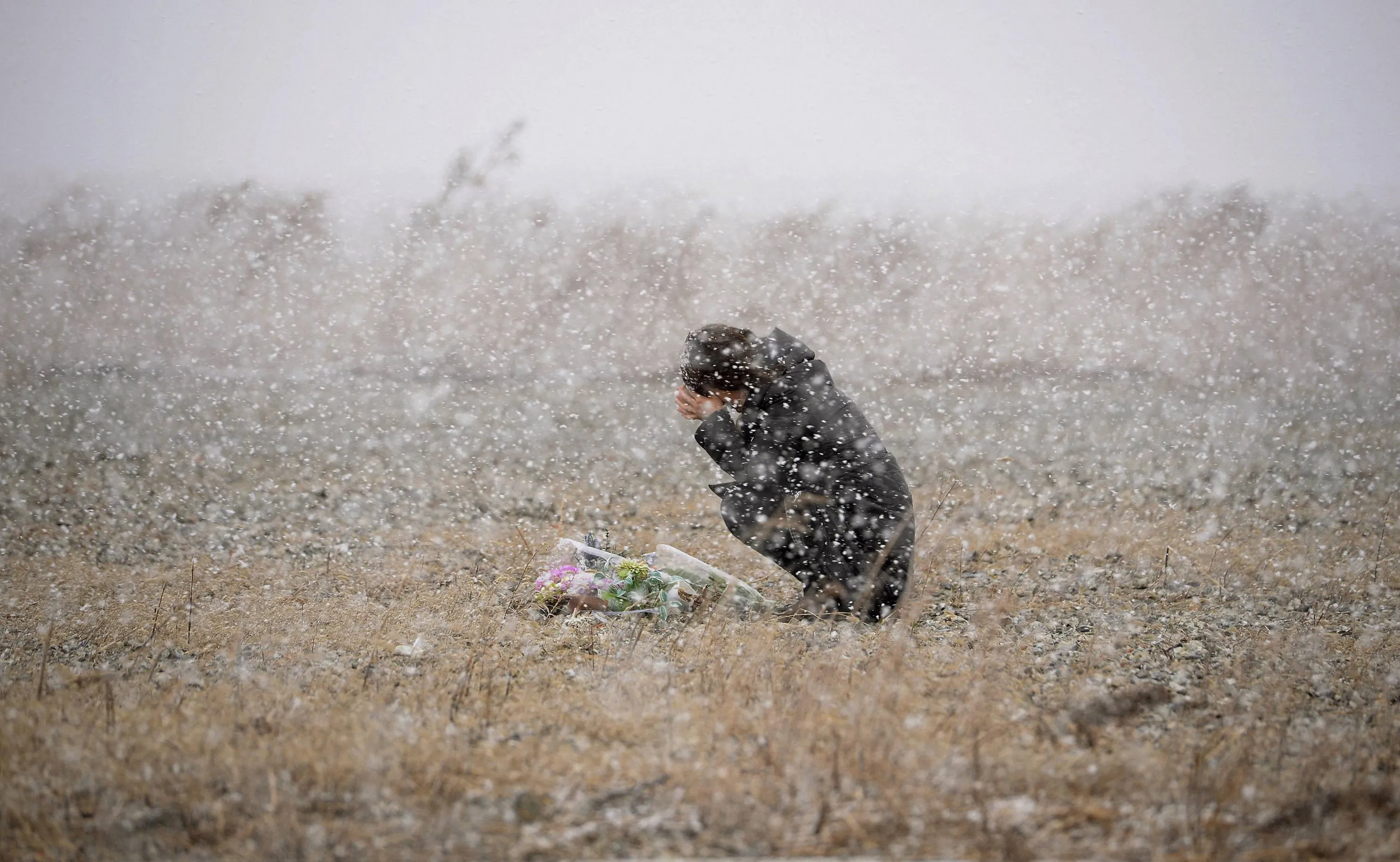 A woman prays for the deceased of the March 11, 2011 earthquake and tsunami, as snow falls, at a place where she was employed at a photo studio at the time, in Rikuzentakata, Iwate prefecture, in this file photo taken by Kyodo March 11, 2014. (Photo by Reuters/Kyodo News)