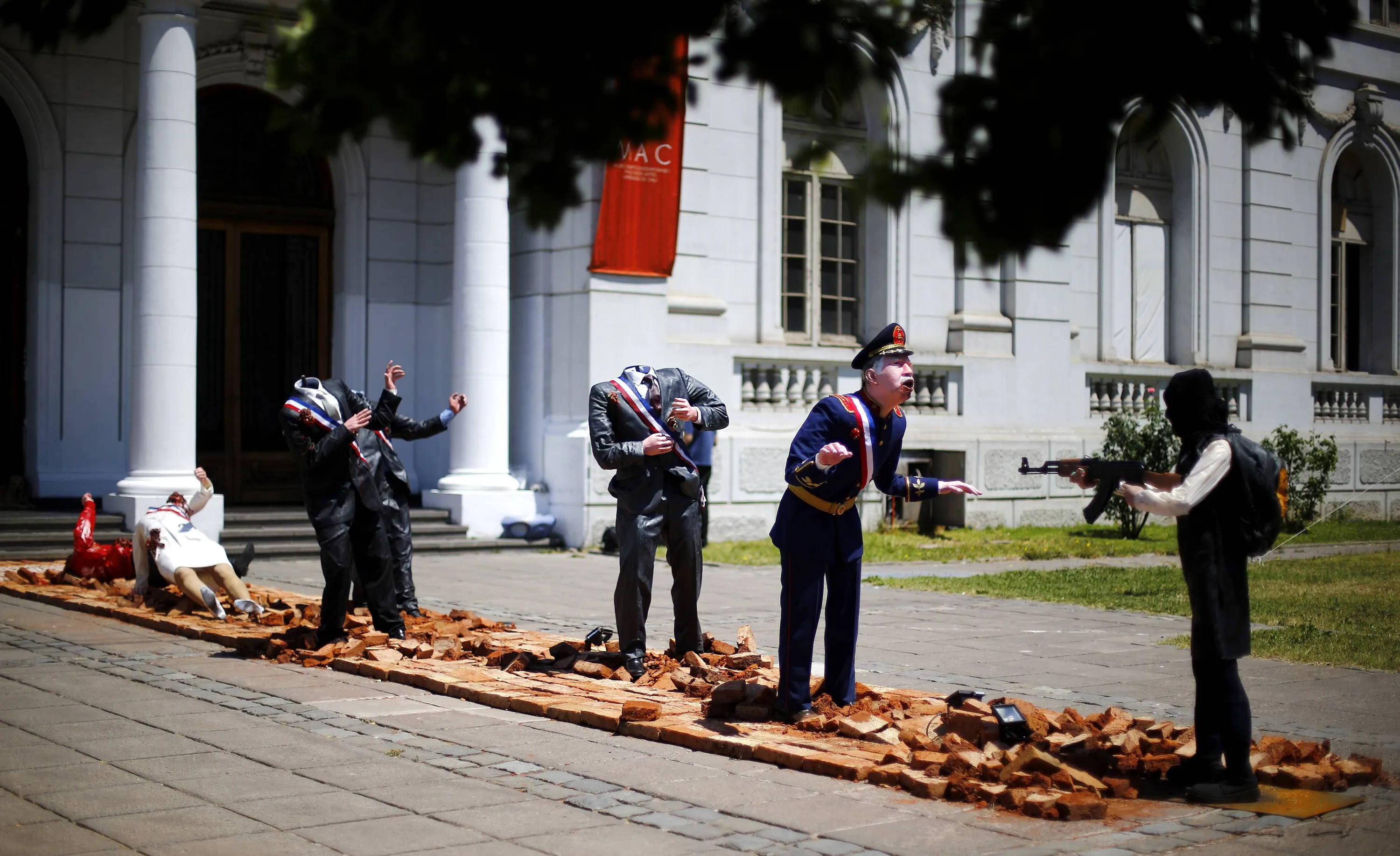 A sculptural artwork depicting a hooded high school student shooting former Chilean dictator Augusto Pinochet and headless presidents is seen at the Contemporary Art Museum in Santiago, December 2, 2014. The artwork, part of the “El ladrillo angular” (The angular brick) exhibition, portrays a student fighting against the ongoing continuity of dictatorship because of a political and economic system which has been impossible to destroy, according to “Papas Fritas” the artwork's creator. (Photo by Ivan Alvarado/Reuters)