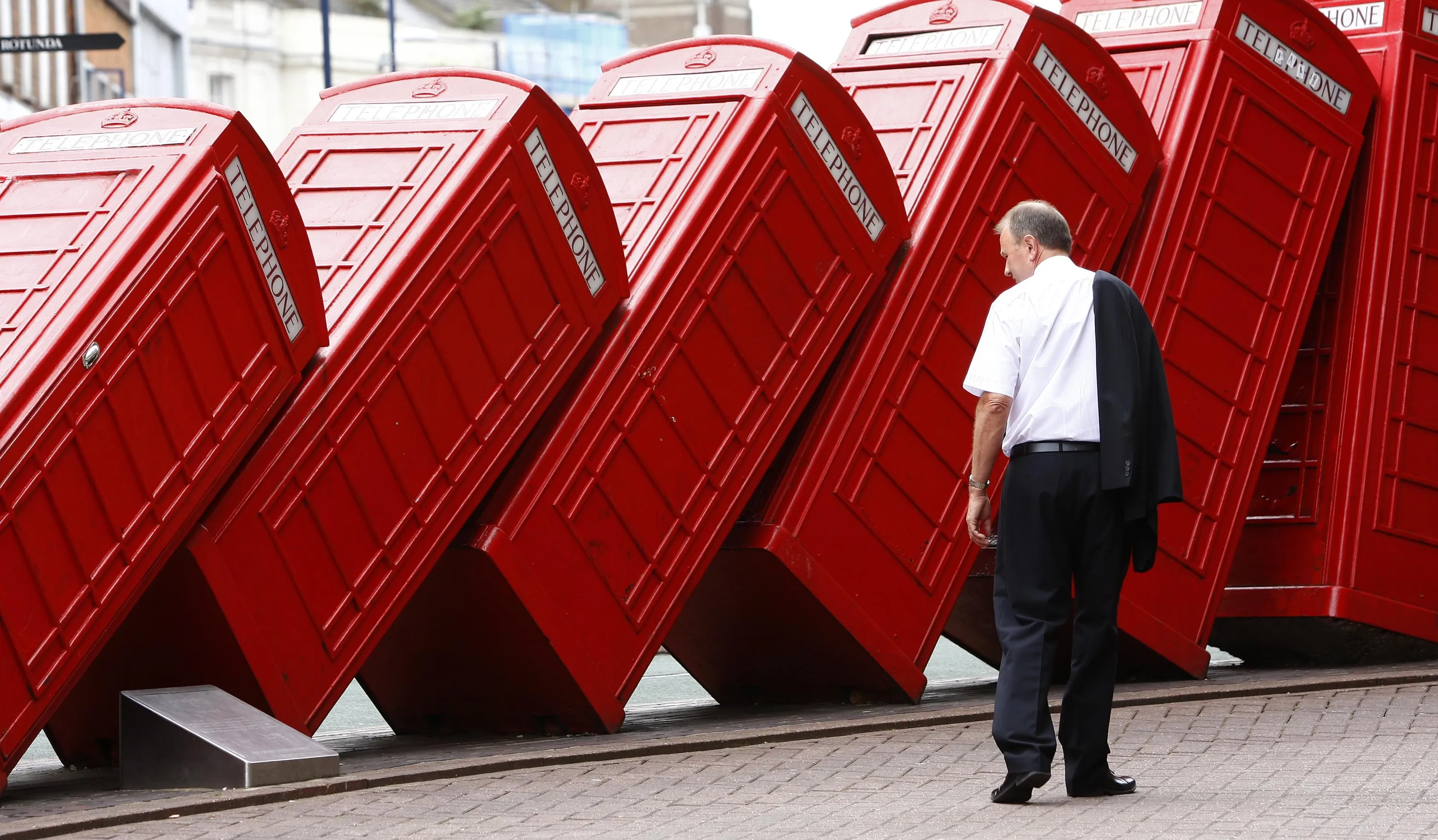A piece by artist David Mach and entitled “Out of Order” shows a row of traditional English red phone boxes in Kingston, south of London, July 15, 2008. (Photo by Eddie Keogh/Reuters)