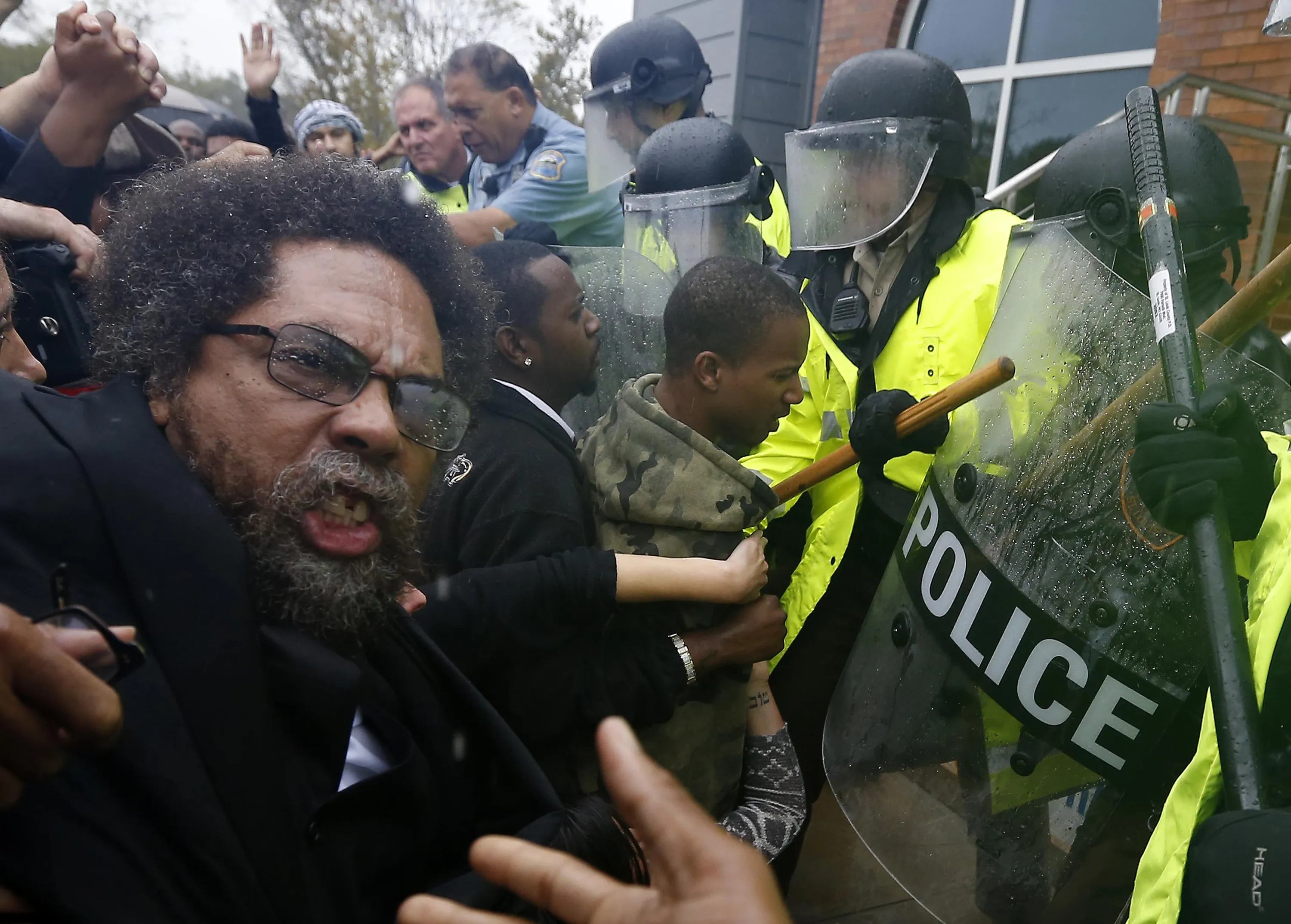 Activist Cornel West (L) is knocked over during a scuffle with police during a protest at the Ferguson Police Department in Ferguson, Missouri, in this October 13, 2014 file photo. (Photo by Jim Young/Reuters)