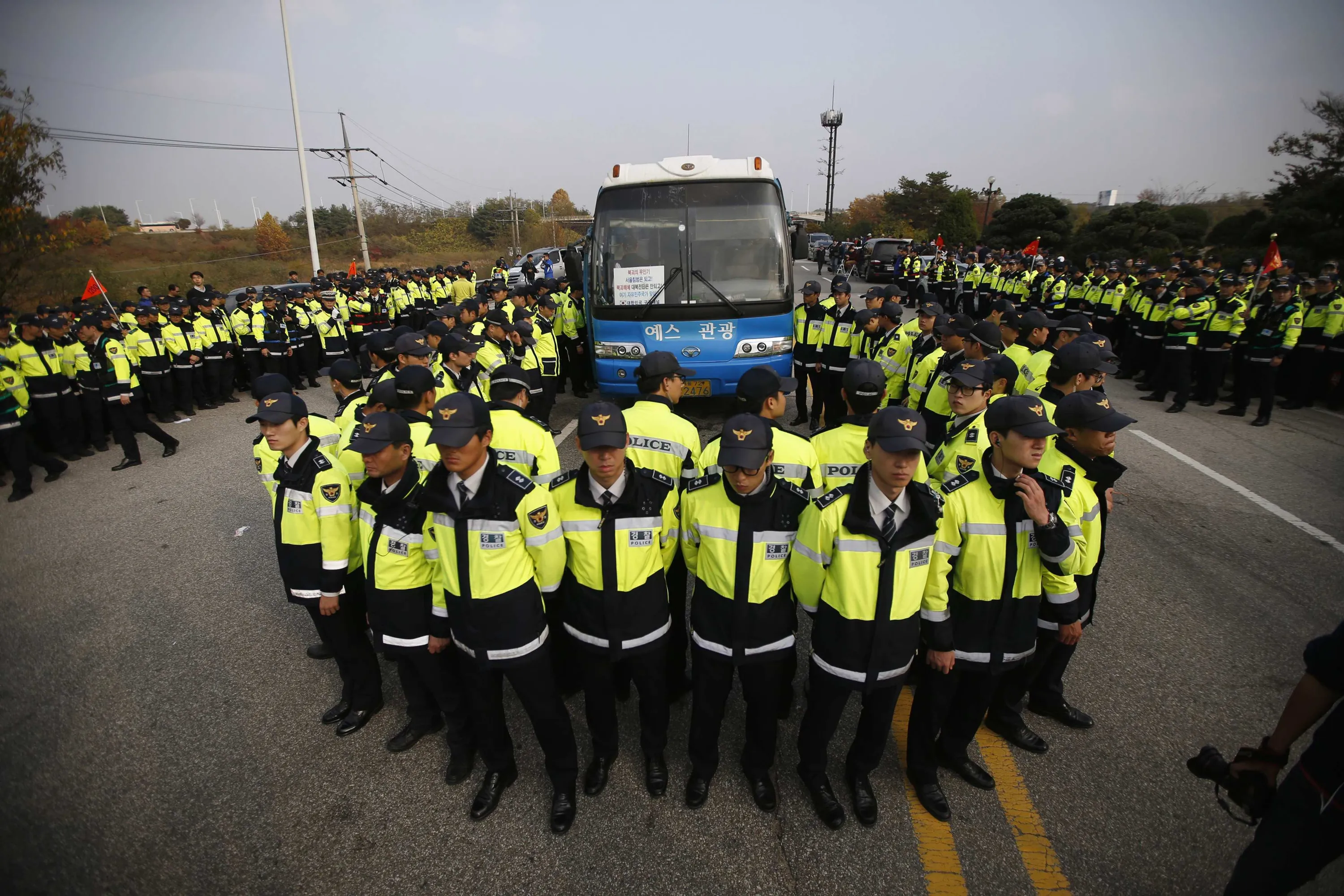 A bus transporting members of an anti-North Korean civic group is surrounded by South Korean policemen near the demilitarised zone separating the two Koreas, in Paju, in this October 25, 2014 file photo. (Photo by Kim Hong-Ji/Reuters)