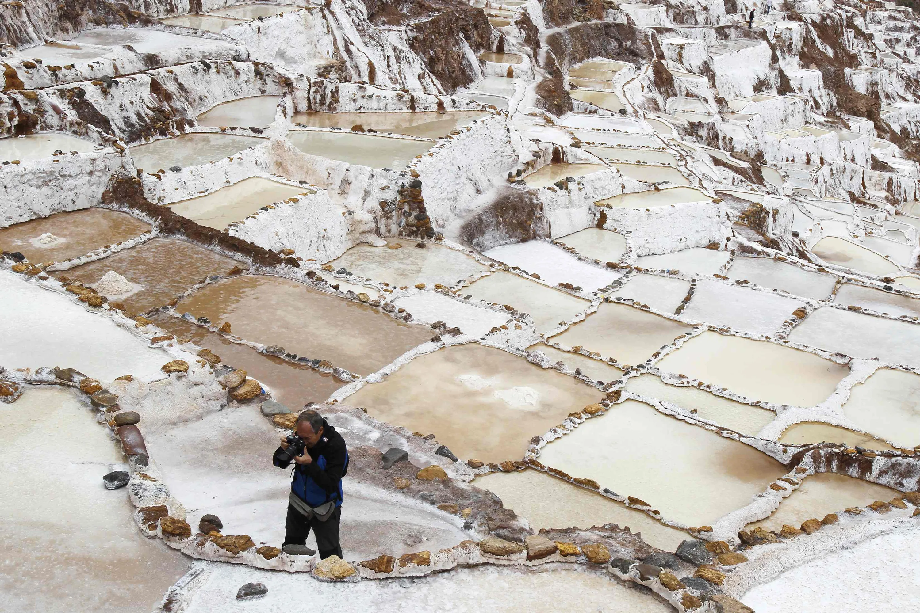 A tourist takes pictures of a salt pond at the Maras mines in Cuzco December 3, 2014. (Photo by Enrique Castro-Mendivil/Reuters)