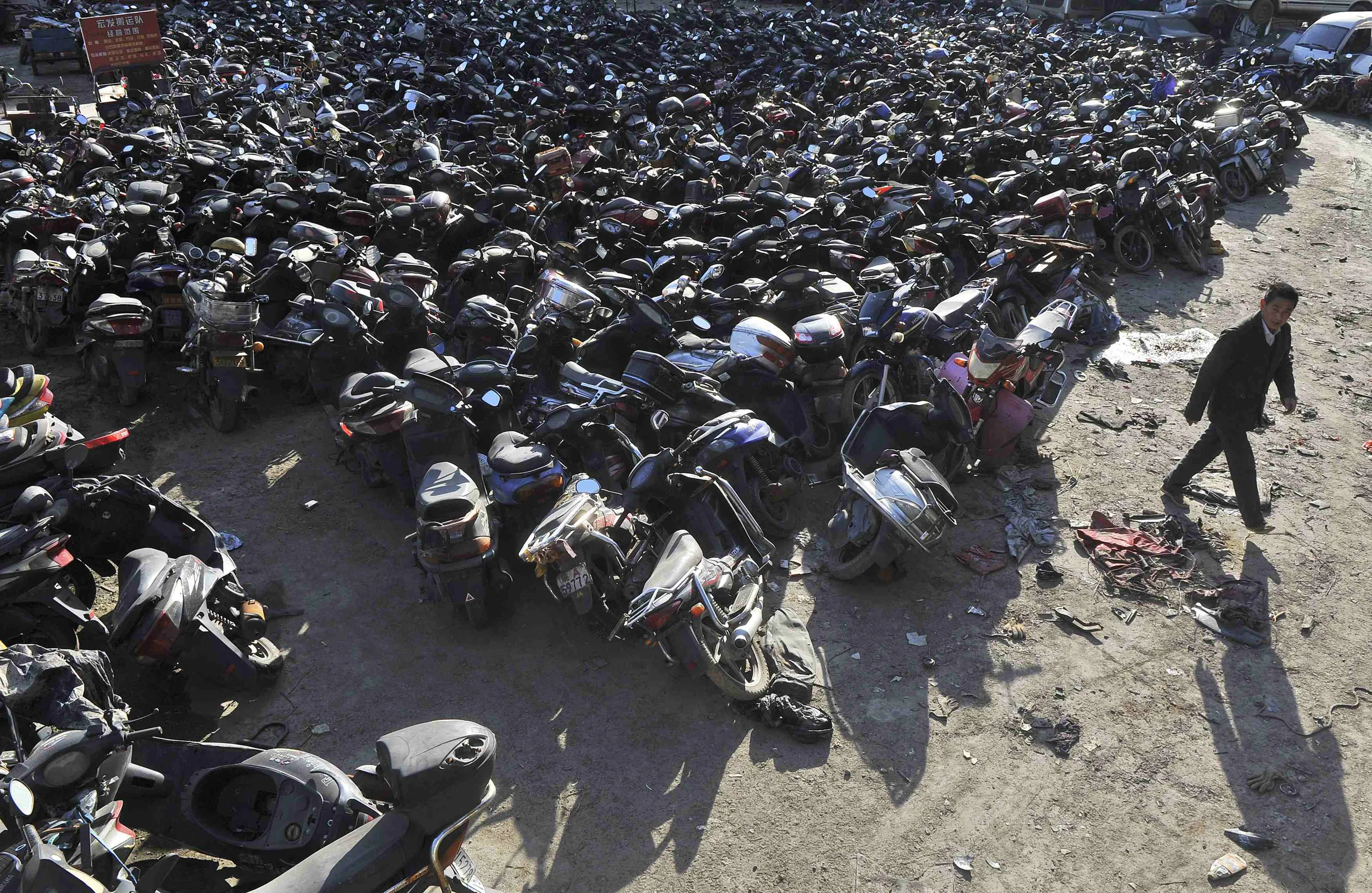 Motorcycles and electric bicycles impounded by the police from their owners after causing traffic accidents are seen at a parking lot in Hefei, Anhui province, December 4, 2014. (Photo by Reuters/Stringer)