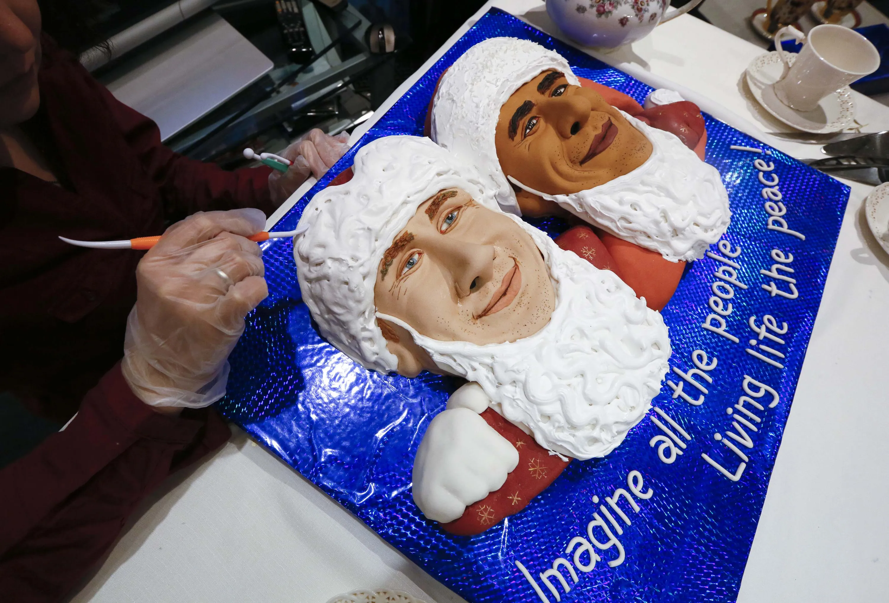 Russian artist Yelena Zelenskaya puts the finishing touches on a pie she baked to look like U.S. President Barack Obama and Russia's President Vladimir Putin dressed as Santa Claus and Father Frost, before the art performance named “Sweet Sanctions 2. Five O'Clock Tea With Presidents”, during a TV broadcasting of Putin's address to members of parliament and other top officials in the Kremlin, at the Romanov's art gallery in Krasnoyarsk, Siberia, December 4, 2014. (Photo by Ilya Naymushin/Reuters)