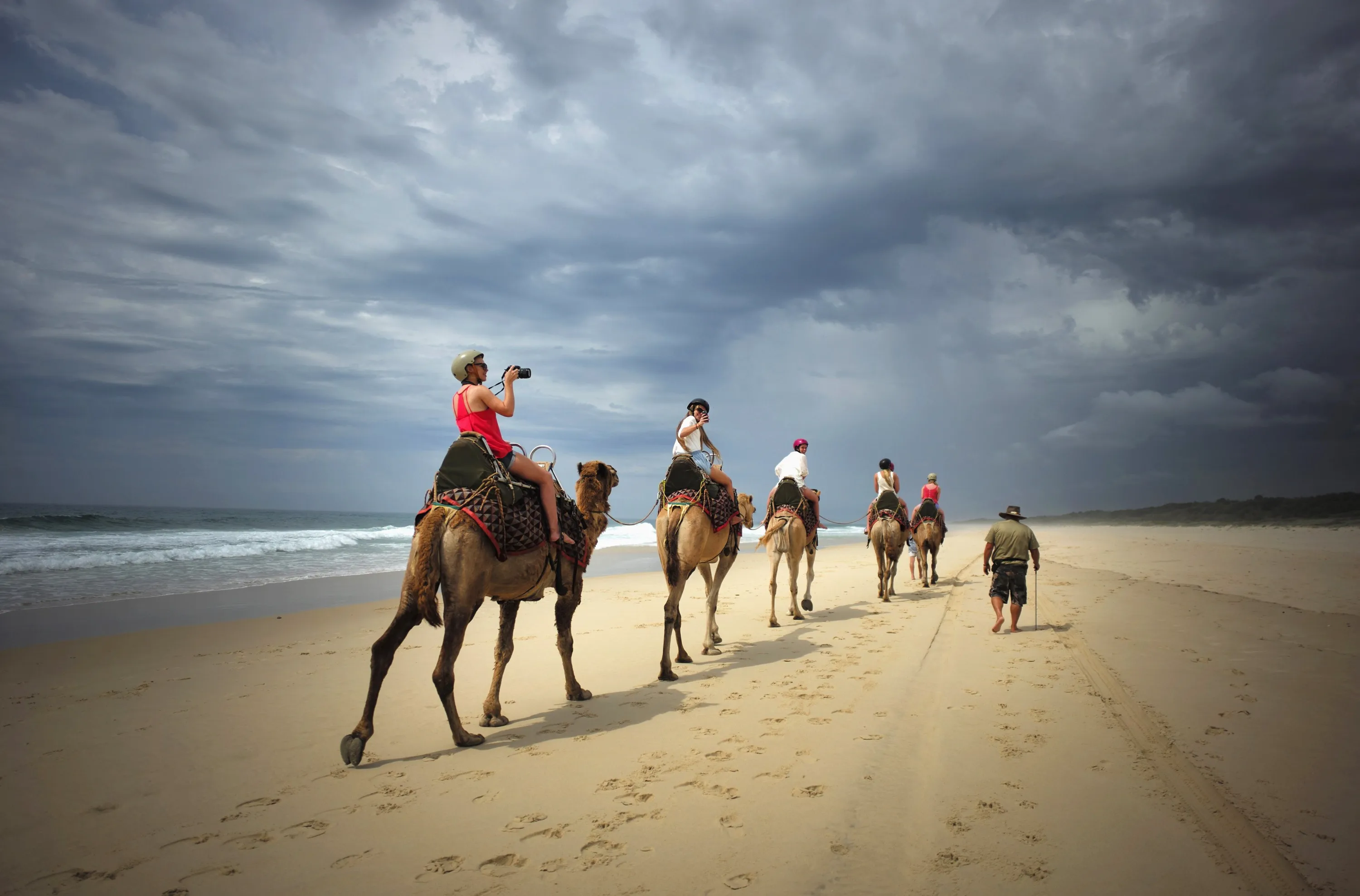 A tourist takes a picture under storm clouds during a camel safari tour alongside the Pacific Ocean on Lighthouse Beach, north of Sydney, December 4, 2014. (Photo by Jason Reed/Reuters)