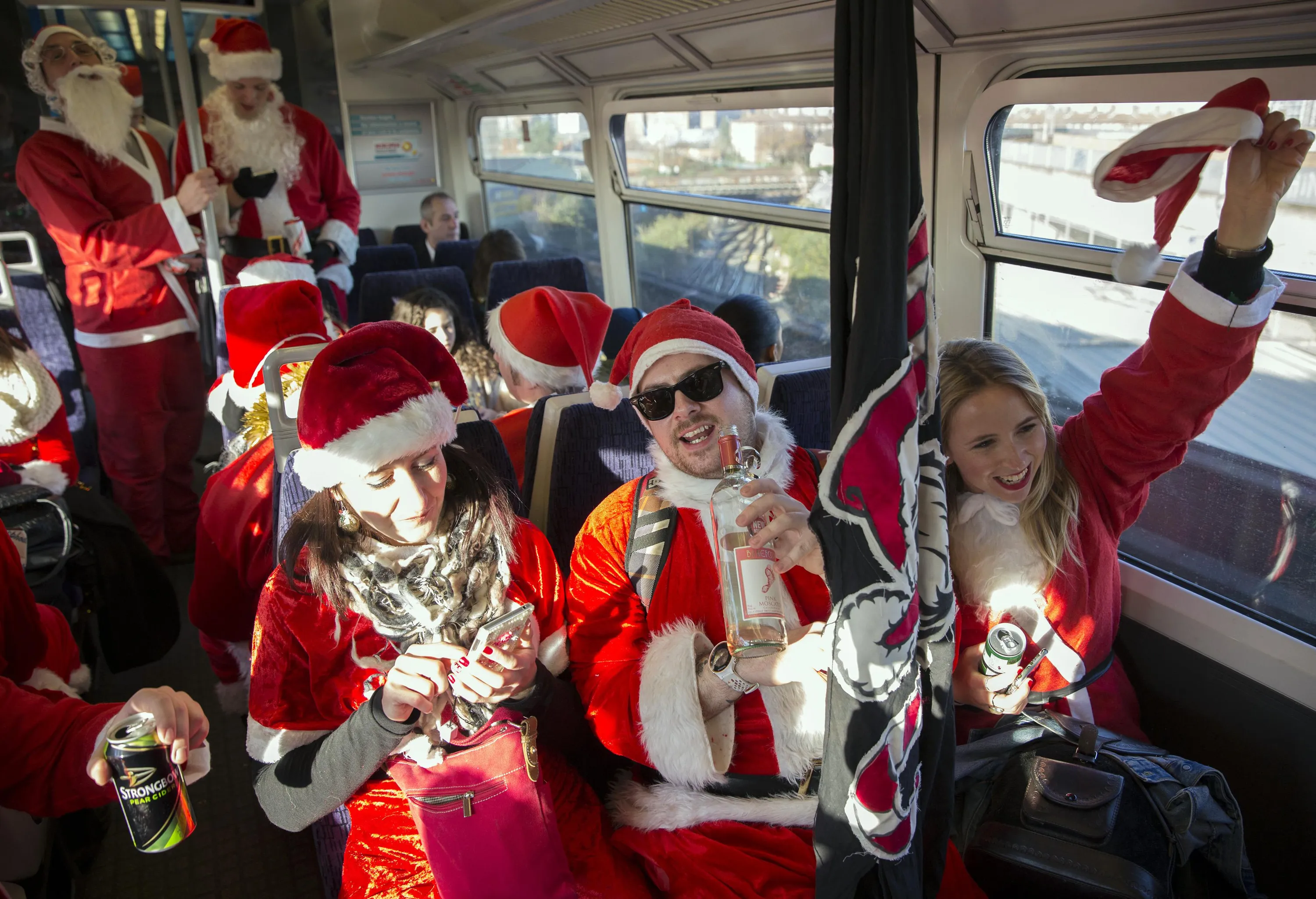 Participants dressed in Santa costumes sing on a train during the annual SantaCon event in London December 6, 2014. (Photo by Neil Hall/Reuters)