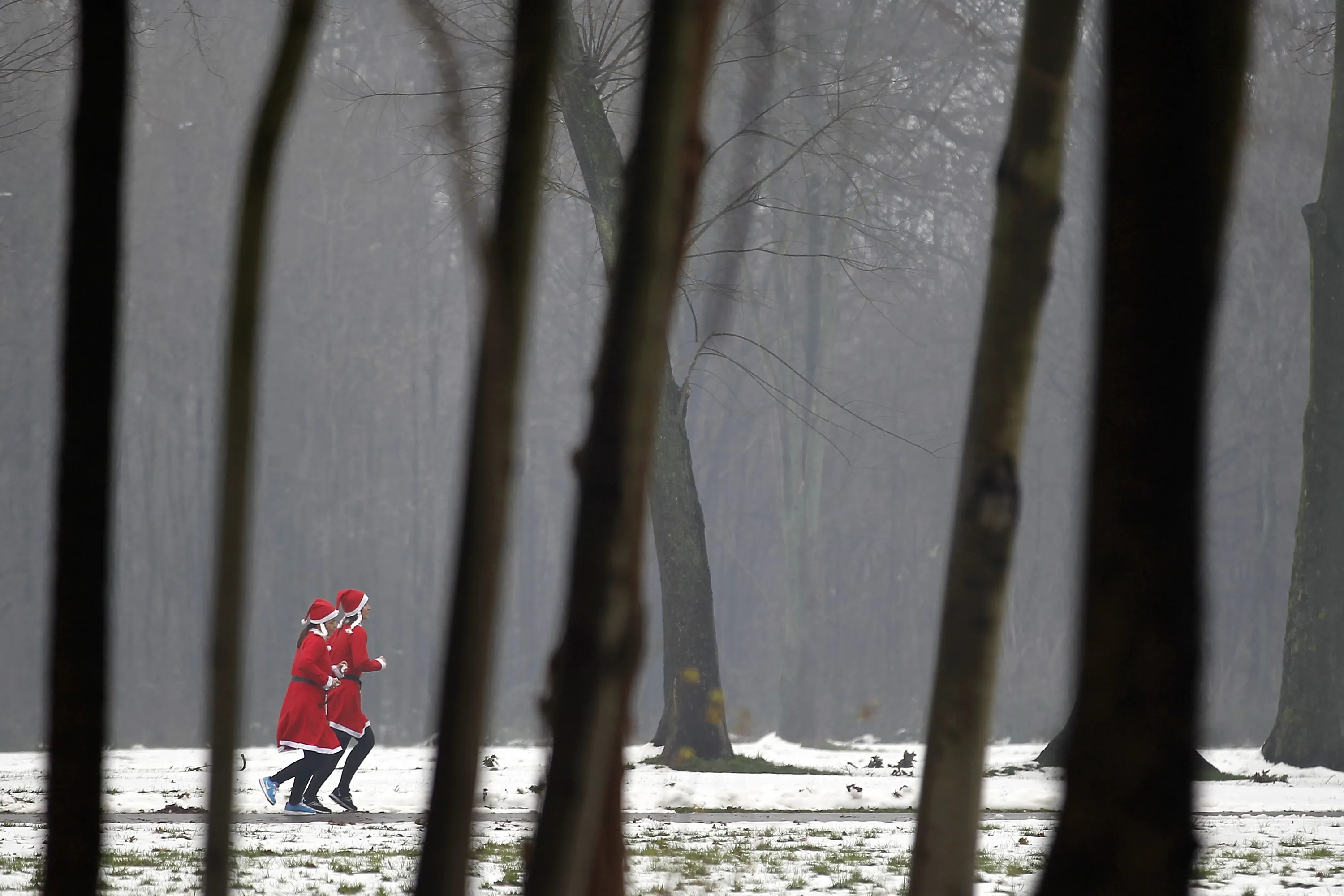 Costumed participants attend the “Santa Claus Run” in Mogosoaia, near Bucharest December 6, 2014. About 100 participants attended the event organised for the benefit of the Romanian Association of Pediatric Orthopedists and Traumatologists. (Photo by Bogdan Cristel/Reuters)