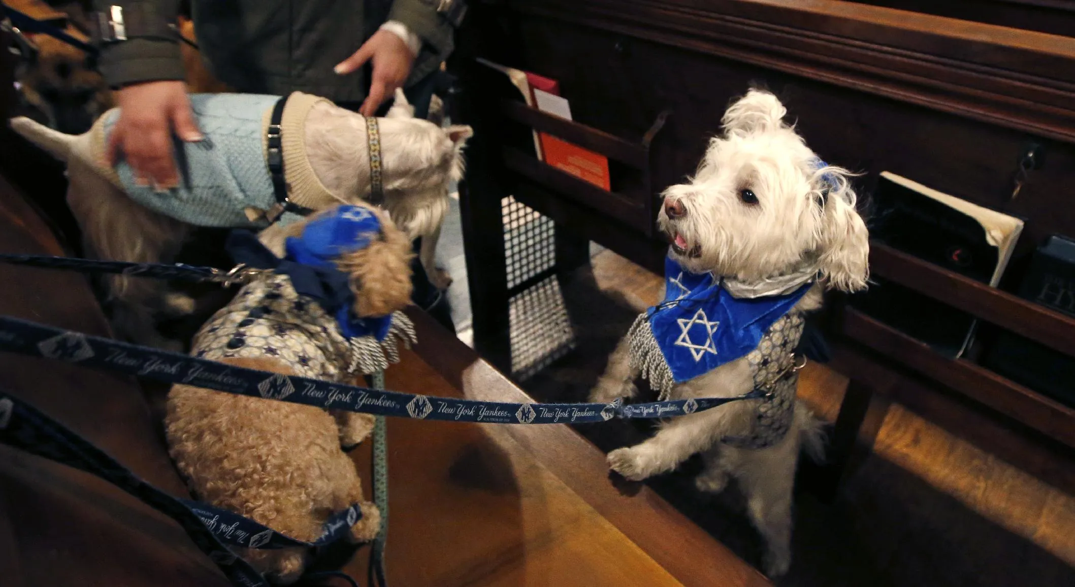 Lukas, right, wearing a yarmulke and tallis with a Jewish star plays in a pew with Buttercup, center, and another dog during the 6th annual Blessing of the Animals at Christ Church of Manhattan in New York, Sunday, December 7, 2014. (Photo by Kathy Willens/AP Photo)