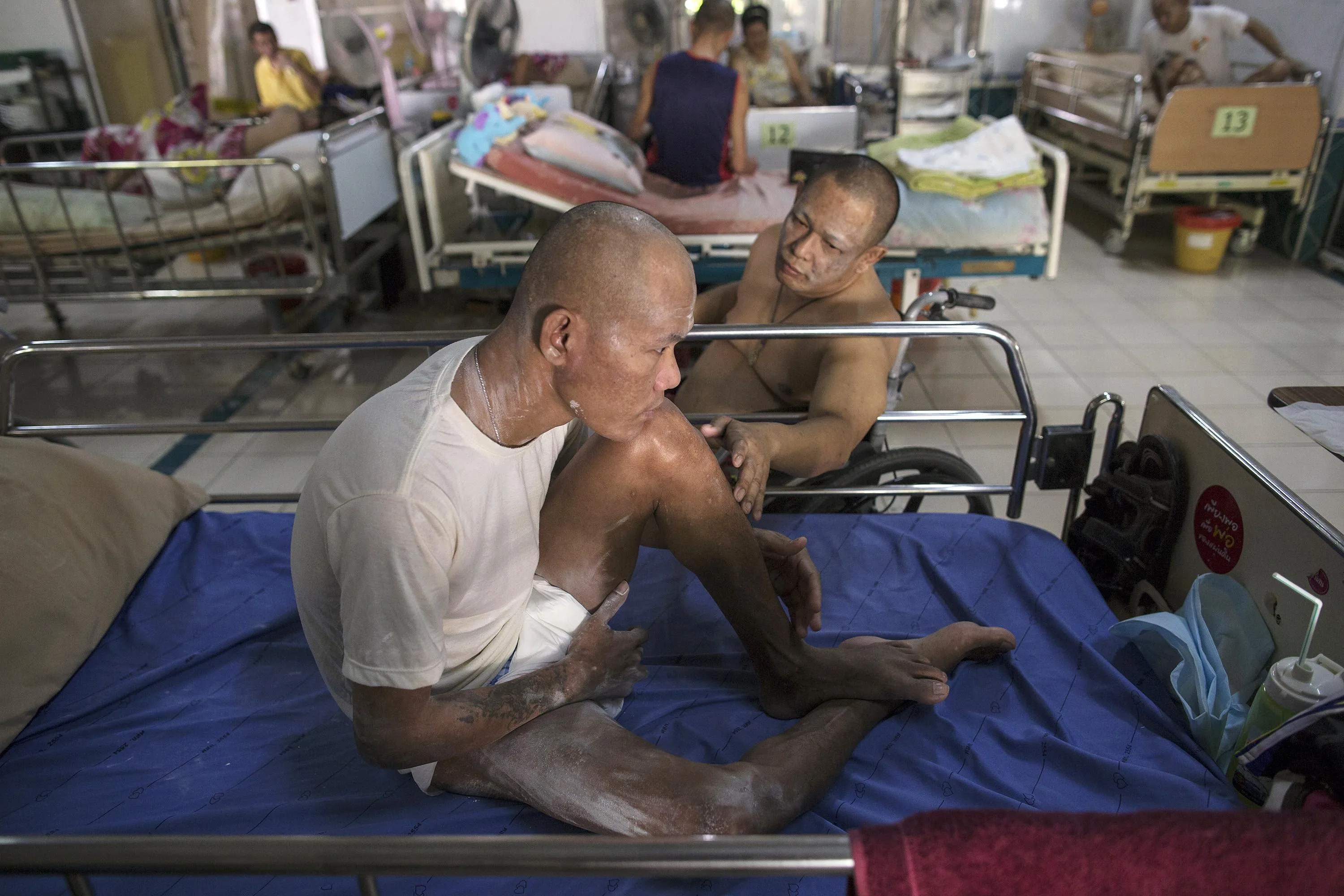 A terminally ill man is comforted by another patient in a hospice for those dying of AIDS at the Buddhist temple Wat Prabat Nampu in Lopburi province, north of Bangkok November 30, 2014. (Photo by Damir Sagolj/Reuters)