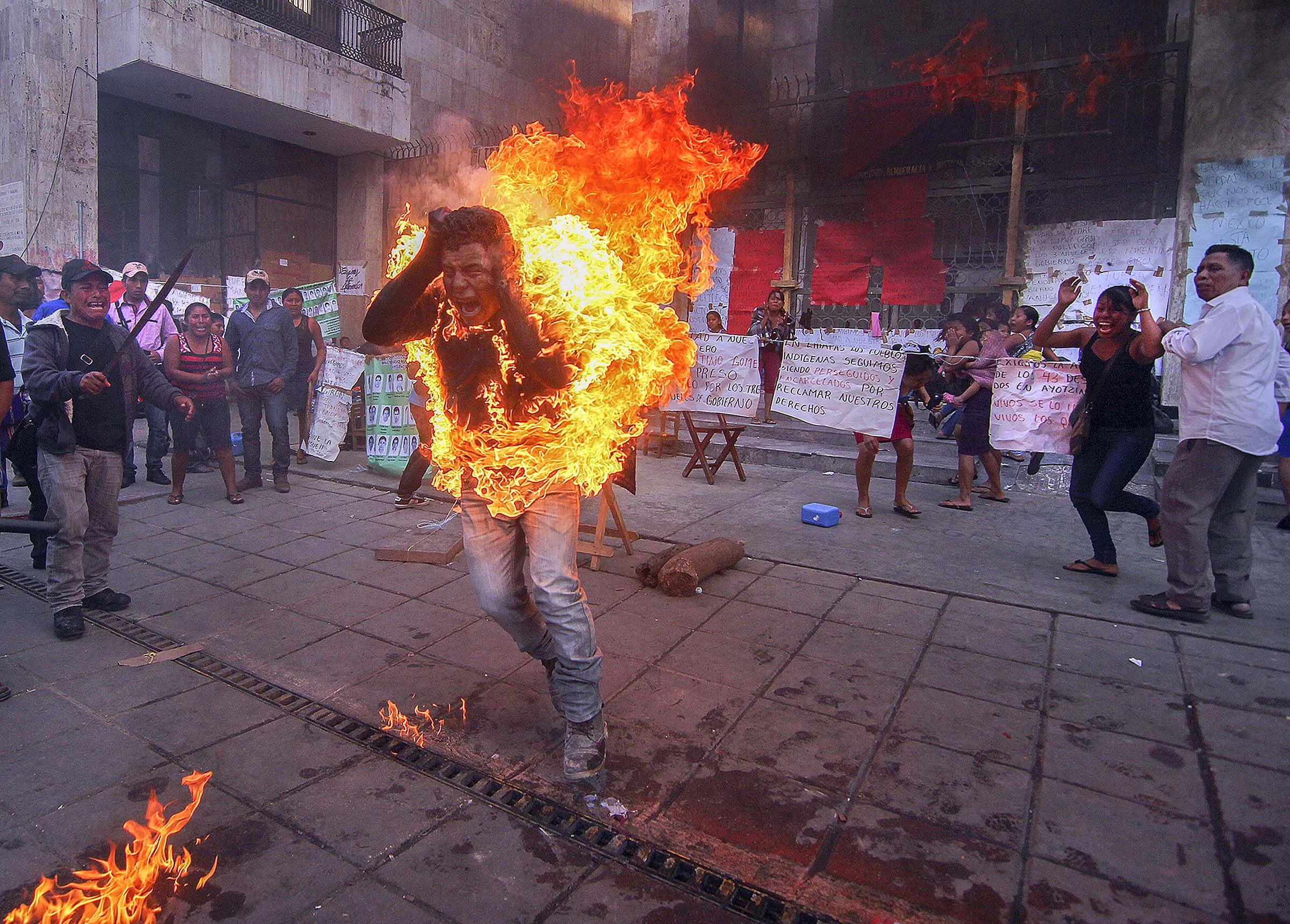 Farmer Agustin Gomez Perez is engulfed in flames after he was set on fire to protest the imprisonment of his father who is charged with murder, stealing cattle and organized crime in Tuxtla Gutierrez, Mexico, December 5, 2014. (Photo by Jacob Garcia/Cuartoscuro)