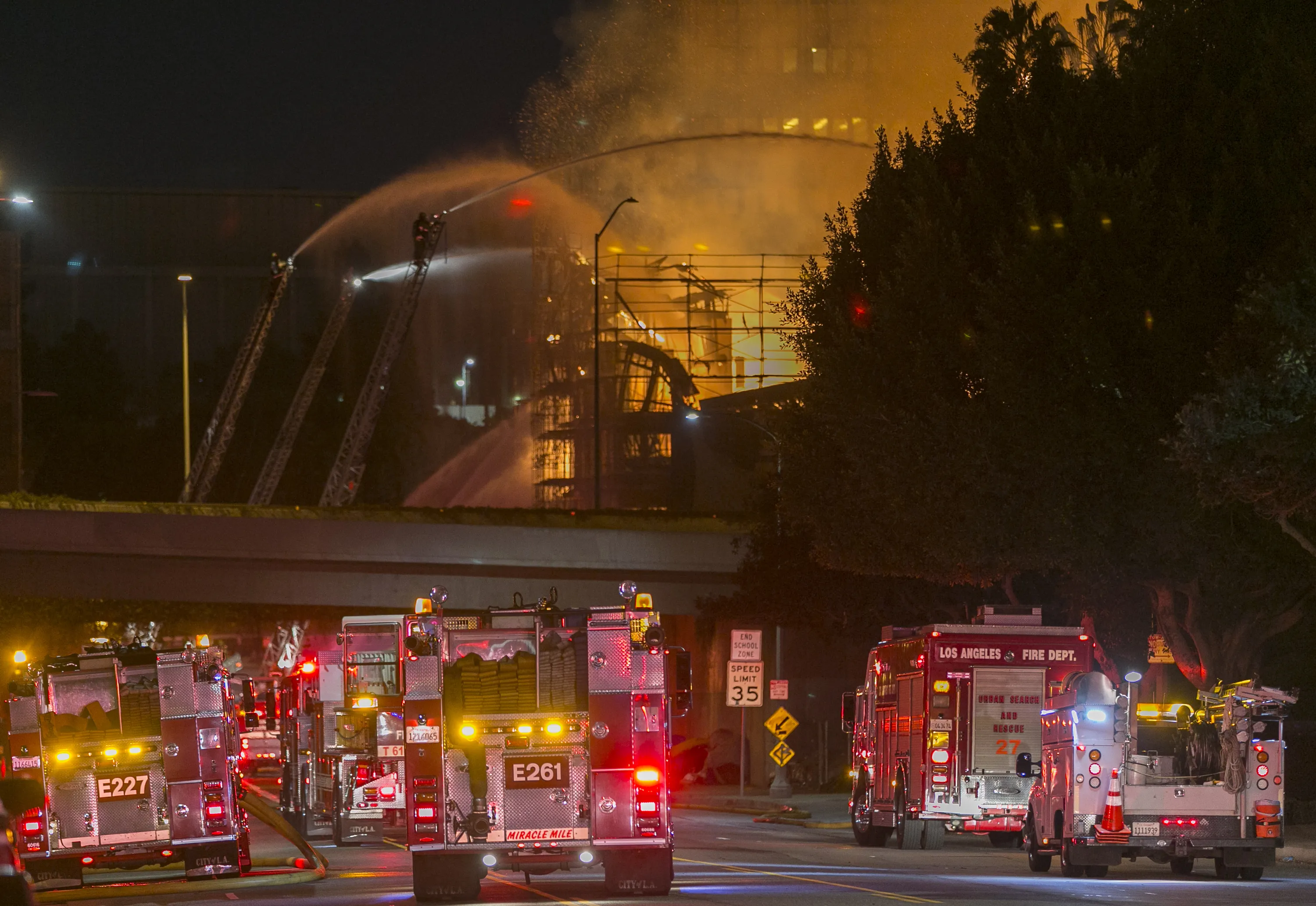Los Angeles County firefighters battle a fire at an apartment building under construction next to the Harbor CA-110 Freeway in Los Angeles, early Monday, December 8, 2014. (Photo by Damian Dovarganes/AP Photo)