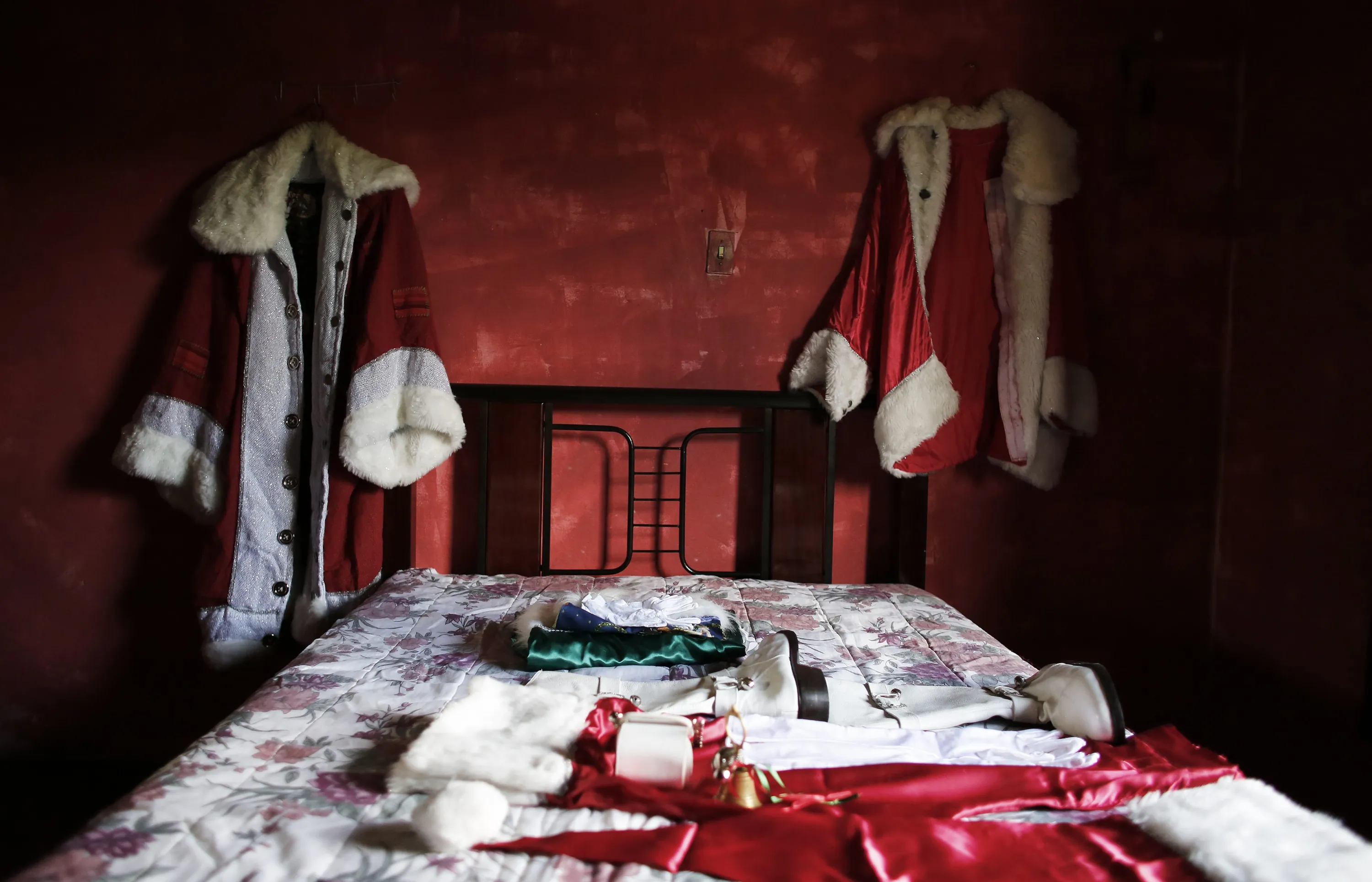 A Santa Claus costume, belonging to Vitor Martins (not pictured), is seen in the bedroom of his house, before a performance with children in Sao Caetano do Sul's town square, near Sao Paulo, December 7, 2014. (Photo by Nacho Doce/Reuters)