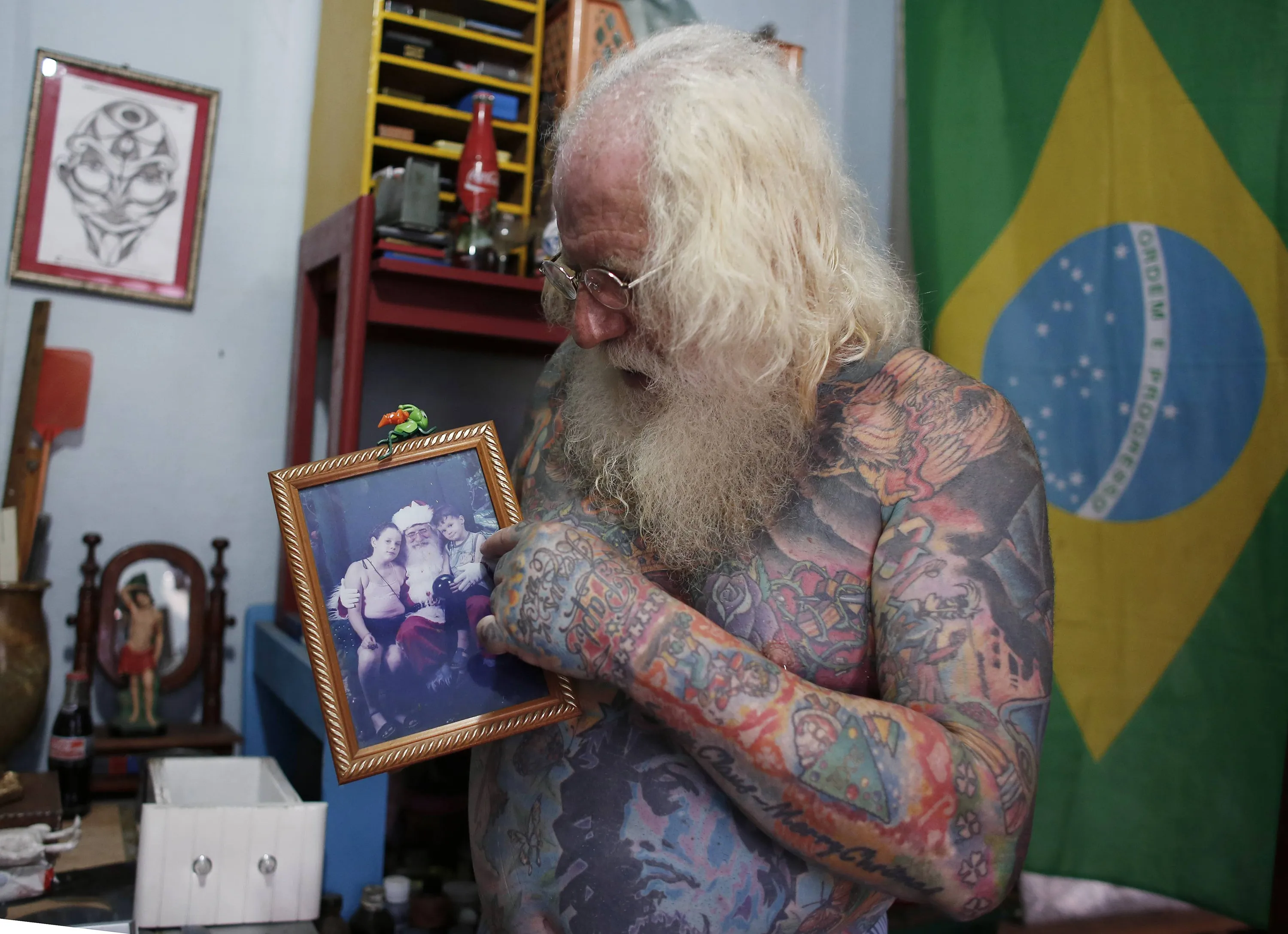 Vitor Martins shows a photo of himself, dressed as Santa Claus with his son and daughter, at his house, before a performance with children in Sao Caetano do Sul's town square, near Sao Paulo, December 7, 2014. (Photo by Nacho Doce/Reuters)