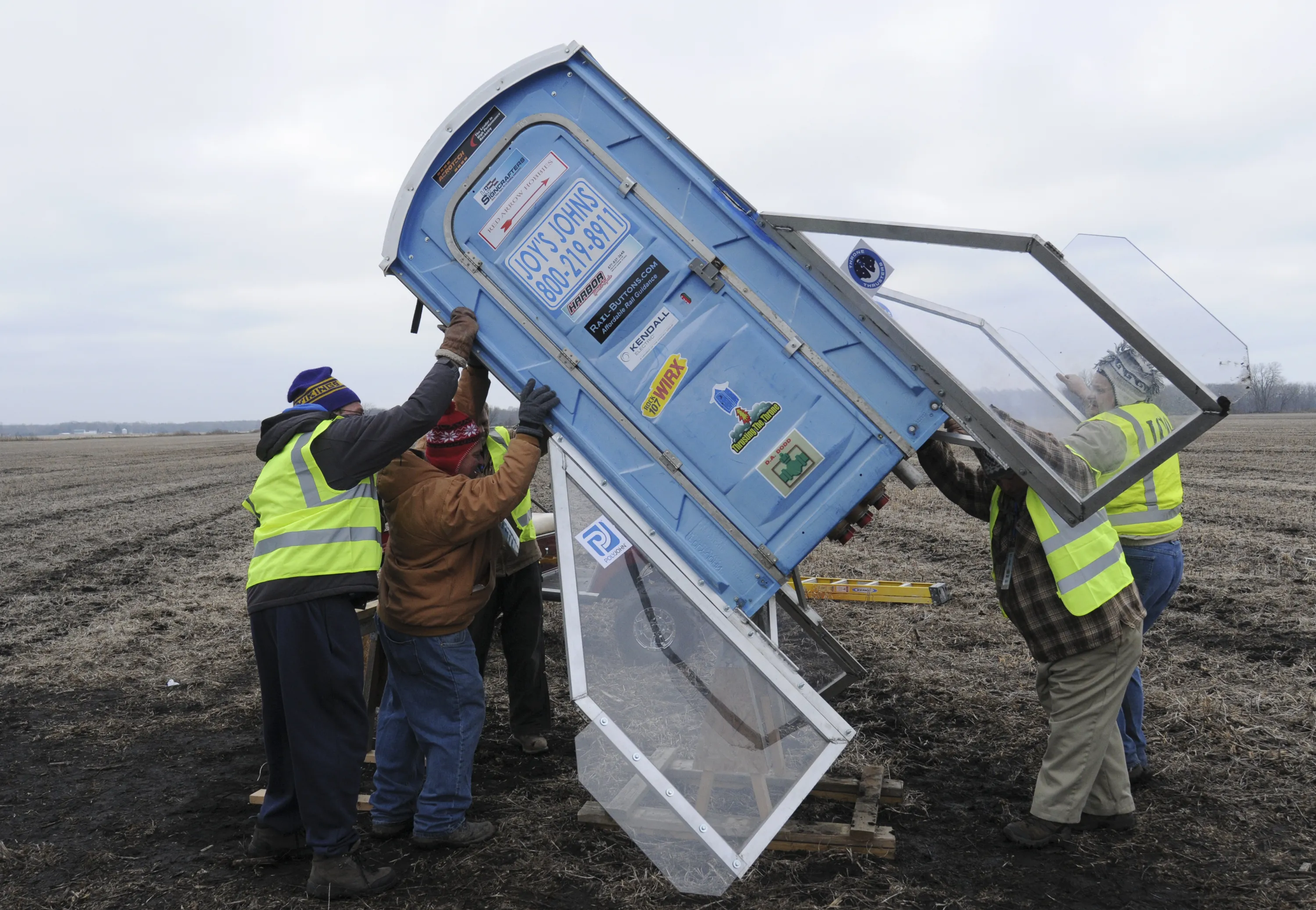 Members of the Michiana Rocketry prep a 10-foot, 450 pound porta-potty, mounted on rocket motors for launching, Saturday, December 6, 2014, from a field in Three Oaks, Mich. (Photo by Don Campbell/AP Photo/The Herald-Palladium)