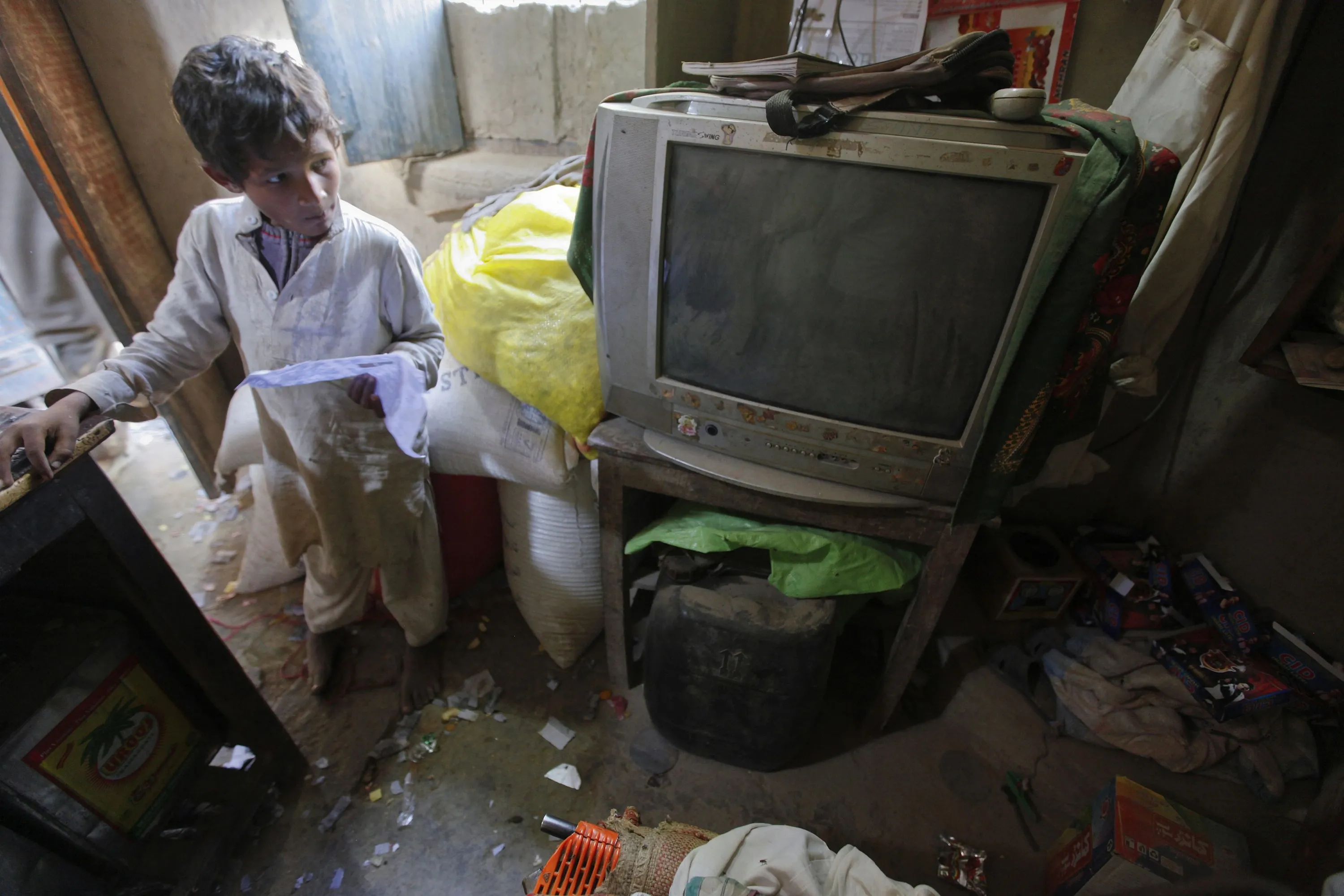 A boy stands near a television set in a grocery shop in Meeran Pur village, north of Karachi November 23, 2014. (Photo by Akhtar Soomro/Reuters)
