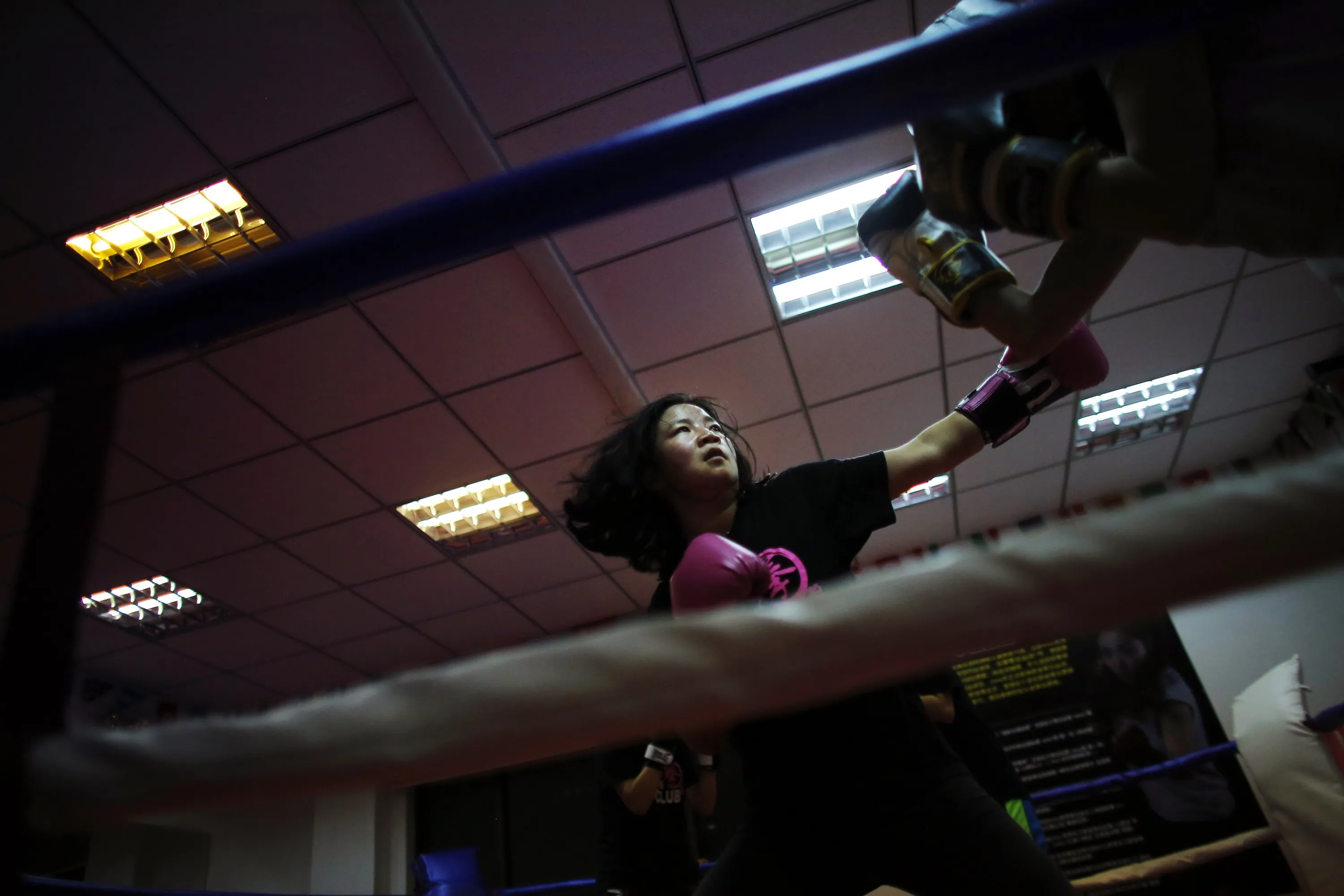 A woman punches during a boxing class at Princess Women's Boxing Club in Shanghai December 3, 2014. (Photo by Carlos Barria/Reuters)