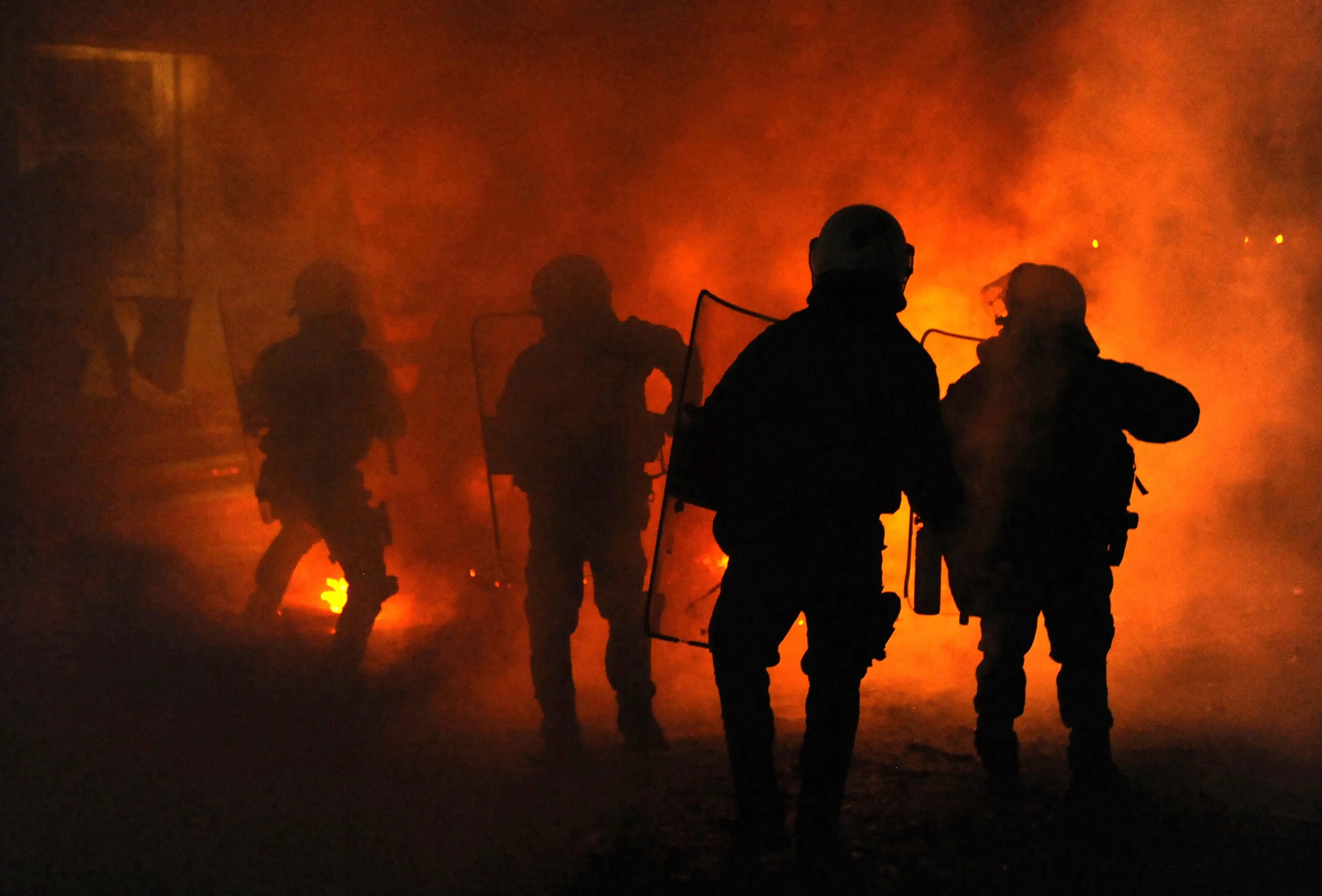 Riot police are seen through a cloud of smoke during clashes with masked youths who occupied the Labour Center of Thessaloniki December 6, 2014. Greek police fired teargas to disperse protesters who hurled petrol bombs at police and set alight bank ATMs and garbage cans in towns around Greece on Saturday, during marches held on the anniversary of the 2008 police killing of a teenager. (Photo by Alexandros Avramidis/Reuters)