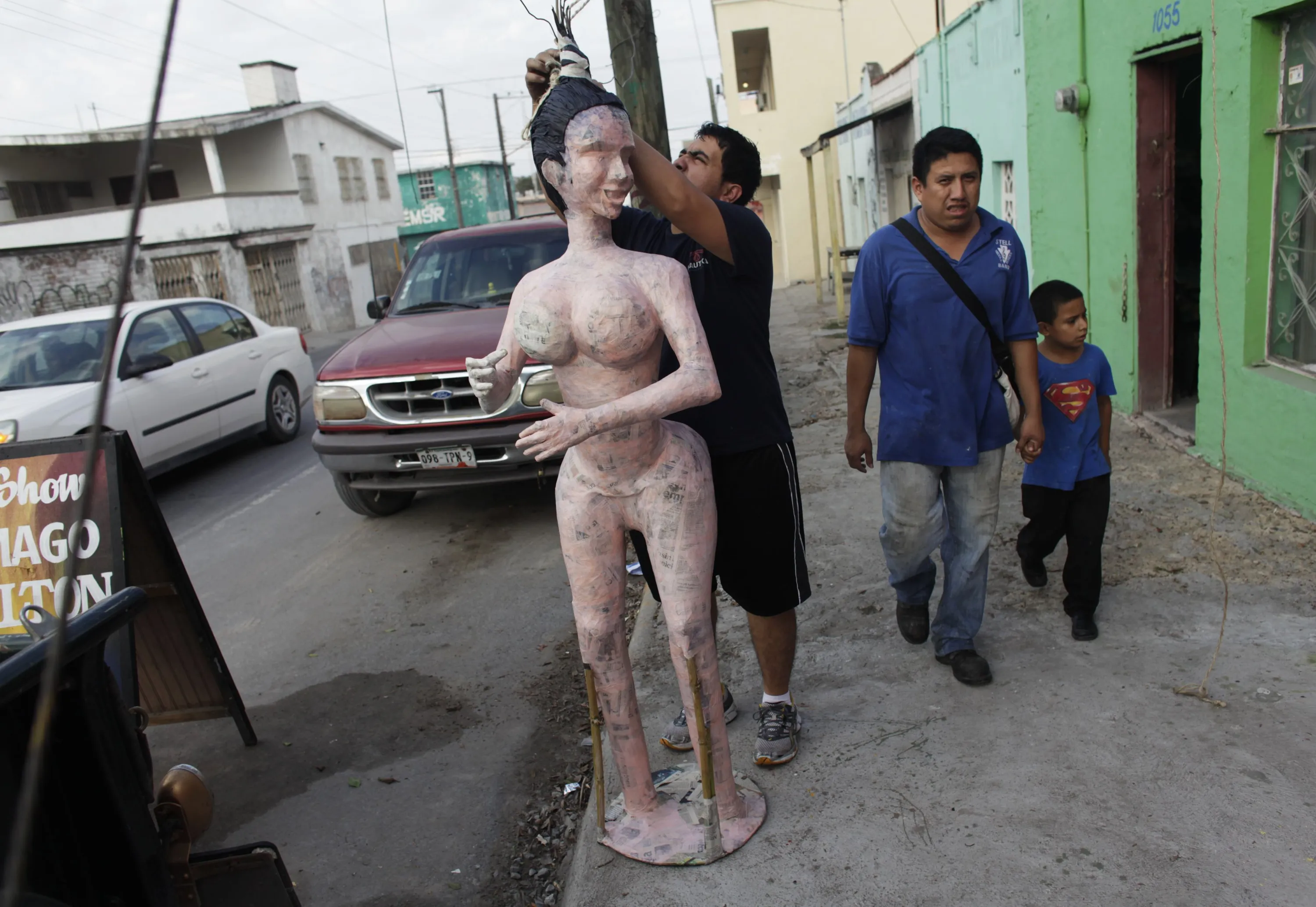 Mexican artisan Dalton Ramirez (partially covered by the pinata) works on a pinata depictingTV celebrity Kim Kardashian while standing outside his workshop in Reynosa December 6, 2014. (Photo by Daniel Becerril/Reuters)